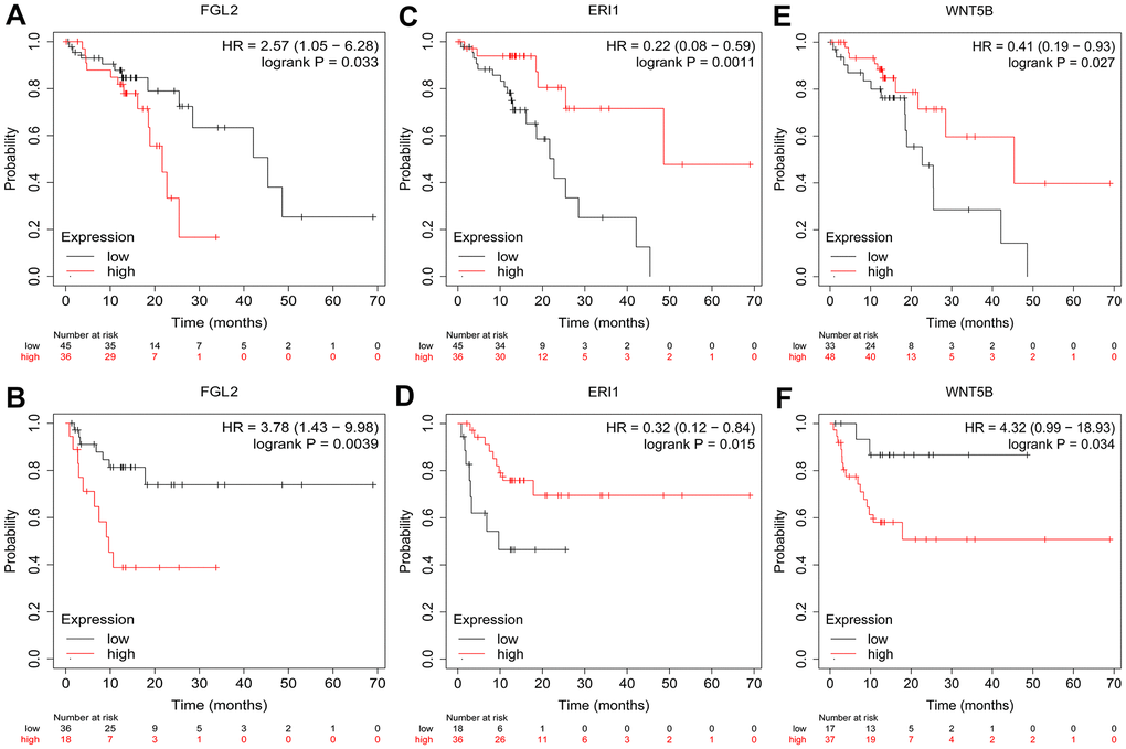 Kaplan-Meier Plotter (http://kmplot.com/analysis/) can be used to assess the effect of any gene or gene combination on survival in breast cancer, lung cancer, ovarian cancer, gastric cancer, colon cancer, prostate cancer, melanoma and 14 other tumor types. The database includes over 50,000 samples that were assessed using gene arrays and RNA sequencing [54]. We used Kaplan-Meier Plotter to determine the correlation of hub gene expression (FGL2, ERI1 and WNT5B) with the OS and RFS of ESCC patients, together with the HR and log-rank P-value.