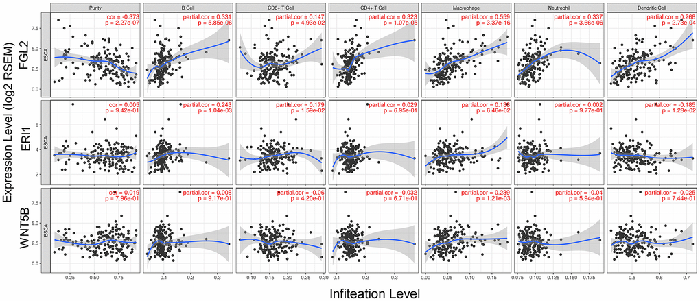 Next, we used the Tumor IMmune Estimation Resource (TIMER) to assess whether FGL2, ERI1 or WNT5B expression correlated with infiltrating immune cell levels in ESCA. Tumor purity significantly influences the genomic analysis of immune cell infiltration in clinical tumor samples [20]. As shown in Figure 4, FGL2 expression correlated negatively with ESCA tumor purity and positively with the infiltrating levels of B cells (r = 0.331, P = 5.85e-06), CD8+ T cells (r = 0.147, P = 4.93e-02), CD4+ T cells (r = 0.323, P = 1.07e-05), macrophages (r = 0.559, P = 3.37e-16), neutrophils (r = 0.337, P = 3.66e-06) and DCs (r = 0.268, P = 2.73e-04). However, ERI1 expression did not correlate significantly with ESCA tumor purity, and only correlated weakly with the infiltrating levels of B cells (r = 0.243, P = 10.4e-03), CD8+ T cells (r = 0.179, P = 1.59e-02) and DCs (r = -0.185, P = 1.28e-02). Similarly, WNT5B expression did not correlate significantly with ESCA tumor purity, and only correlated weakly with the infiltrating levels of macrophages (r = 0.239, P = 1.21e-03). These findings strongly suggested that FGL2 promotes the infiltration of immune cells, especially macrophages, in ESCA.