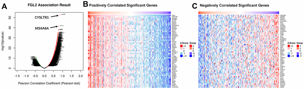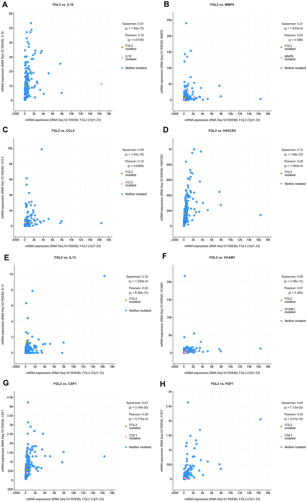 We used the correlation modules in TIMER to explore the correlations between the levels of FGL2 and genetic markers of TIICs (monocytes, TAMs, M1 macrophages, M2 macrophages, T cells [general], CD8+ T cells, B cells, Tregs, Th1 cells, Th2 cells, exhausted T cells, etc.). These genetic markers have been referenced in previous studies [58–60]. The correlation module generates an expression scatterplot between a pair of user-defined genes, as well as the Spearman’s correlation coefficient and statistical significance. Gene levels were calculated as log2 RSEM data.