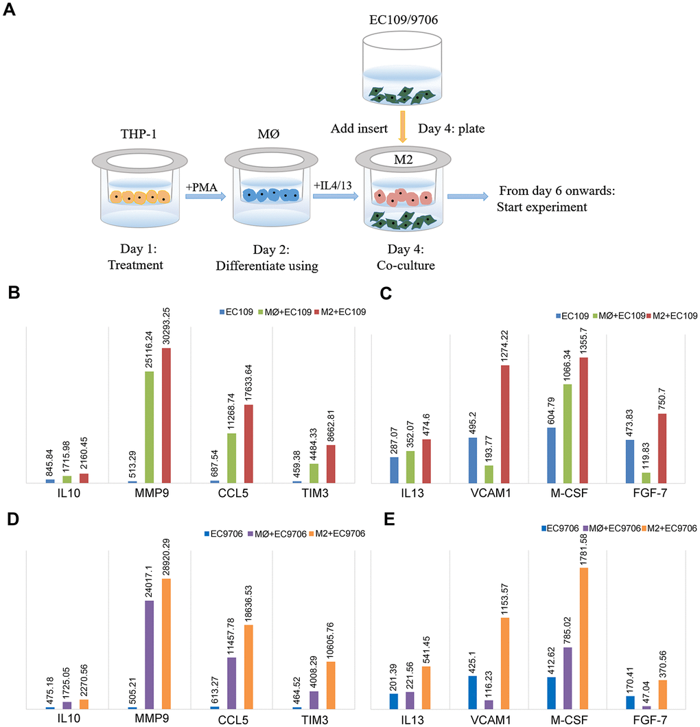 Human ESCC (EC109/9706) cells and leukemia THP-1 monocytes were obtained from Fuxiang Biological Company (Shanghai, China). All cells were maintained in Roswell Park Memorial Institute 1640 medium (Gibco, Carlsbad, CA, USA) supplemented with 10% fetal bovine serum (Gibco), and were cultured in a humidified incubator containing 5% CO2 at 37°C. Phorbol-12-myristate-13-acetate (Beijing 4A Biotech Co., Ltd) was added to the THP-1 monocytes to a final concentration of 40 ng/mL. Approximately 36 h later, the cell morphology was observed under an inverted microscope to confirm that the THP-1 monocytes had been induced to differentiate into M0 macrophages. Then, IL-4 and IL-13 (PeproTech, USA) were added to the M0 macrophages to final concentrations of 8 ng/mL and 4 ng/mL, respectively. After 48 h, the cell morphology was observed under an inverted microscope to confirm that the macrophages had been induced to differentiate into M2 macrophages. The EC109/9706 cells and M2 macrophages were respectively cultured in the upper and lower chambers of six-well plates (Corning Inc., Corning, NY, USA), each with 2 mL of culture medium. The cells were placed in an incubator for 48 h to establish a non-contact co-culture. The non-contact co-culture of EC109/9706 cells and M0 macrophages was established in the same way.