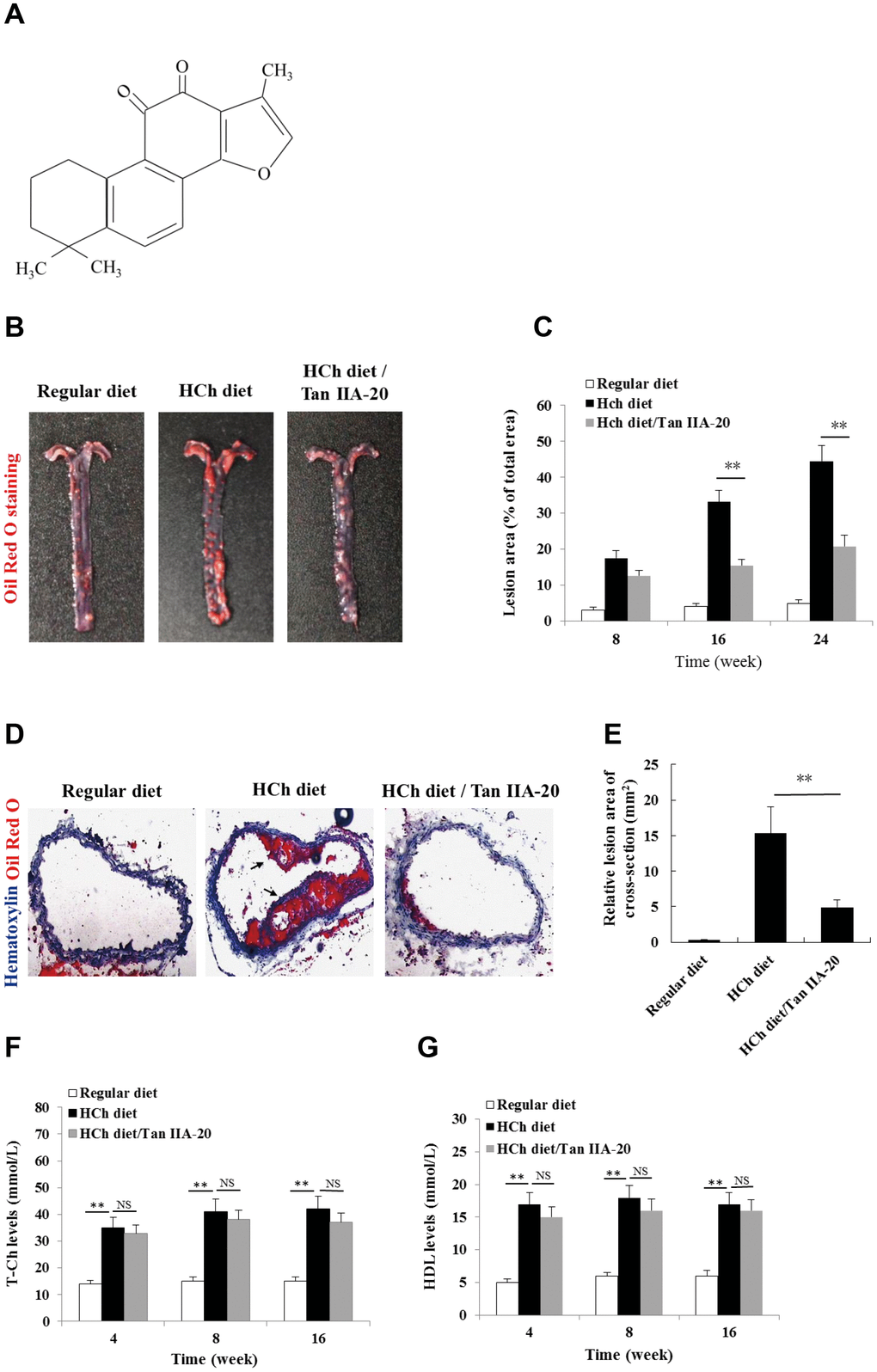 To confirm the anti-AS effect of Tan IIA in vivo, we tested whether the administration of Tan IIA (Figure 1A) could inhibit atherogenesis in the ApoE-/- mice fed with a high-cholesterol diet (HCD). Histomorphological analyses revealed that the AS plaque size in the aorta of the Tan IIA-treated mice (~ 20 % of total area) were significantly lower than that of untreated mice (~ 45 % of total area) (Figure 1B, 1C). Consistently, Tan IIA treatment also strongly reduced cross-section areas of the plaque in HCh-diet-fed mice relative to untreated controls (Figure 1D, 1E). High levels of total Ch (T-Ch), low-density-lipoprotein Ch (LDL-Ch) and triglyceride (TG) in the sera are widely considered as the major risk factors of AS. Although Tan IIA had little effect on serum T-Ch and HDL-Ch levels (Figure 1F, 1G), it significantly decreased the amounts of LDL-Ch and TG in the sera of HCD-fed ApoE-deficient mice (Figure 1H, 1I), with the strongly reduction seen in LDL-Ch (~40%). These results have therefore collectively confirmed Tan IIA’s potent anti-AS activity in vivo.