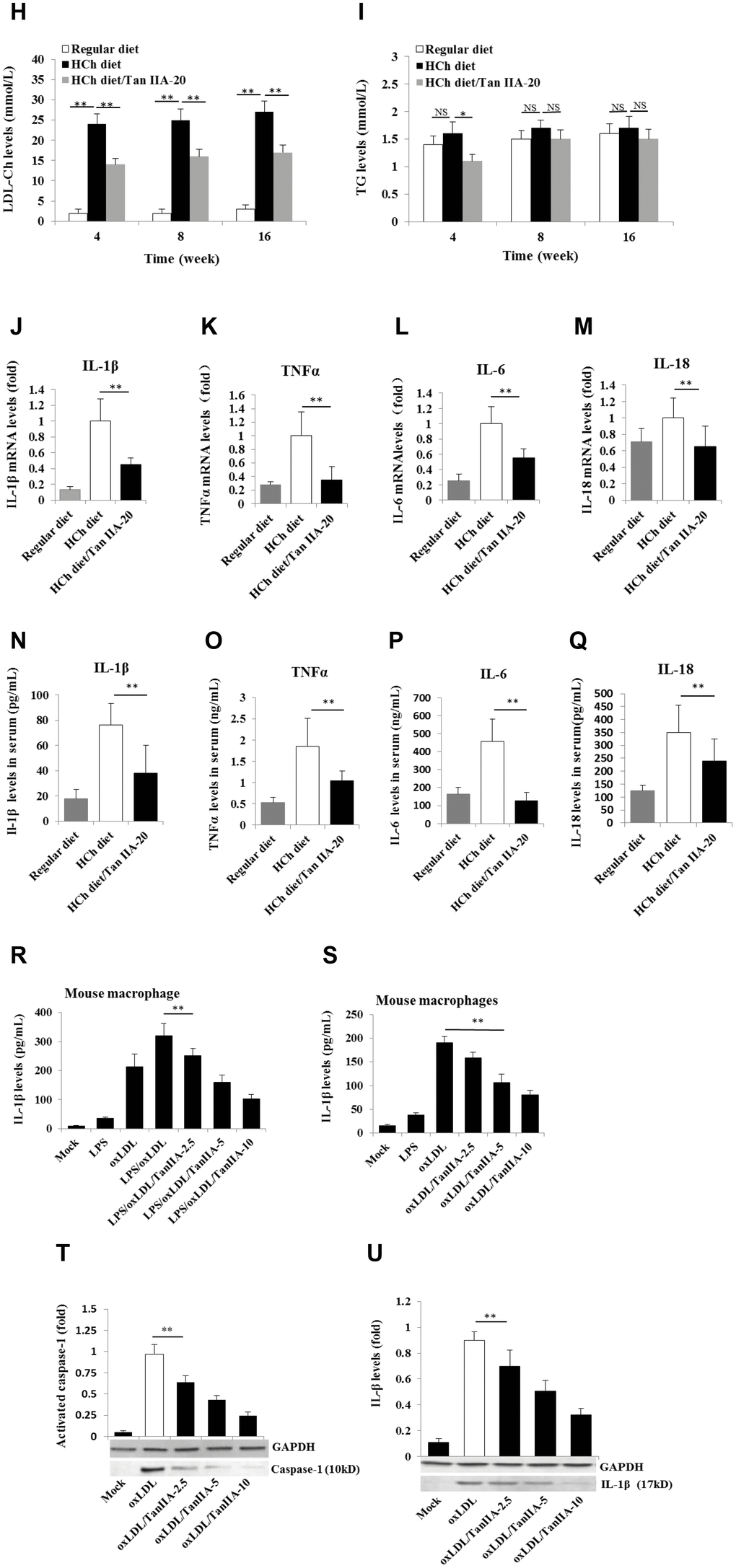 (H–I) Levels of LDL-Ch and TG in the sera of ApoE-deficient mice fed with different diets for 16 weeks. Oxidized LDL-induced and Tan IIA inhibited cytokine (IL-1β, TNFα, IL-6 and IL-18) productions at mRNA levels measured by qRT-PCR in the aortic tissues (J–M) and at protein levels determined by ELISA in the sera (N–Q). (R, S) Effects of Tan IIA (2.5, 5, 10 μg/mL) on oxLDL-induced IL-1β productions in the culture media of LPS-primed and un-primed mouse B6 macrophages, respectively. (T, U) Effects of Tan IIA on oxLDL-induced caspase-1 activation (10 kDa) and IL-1β maturation (17 kDa) in mouse B6 macrophages.