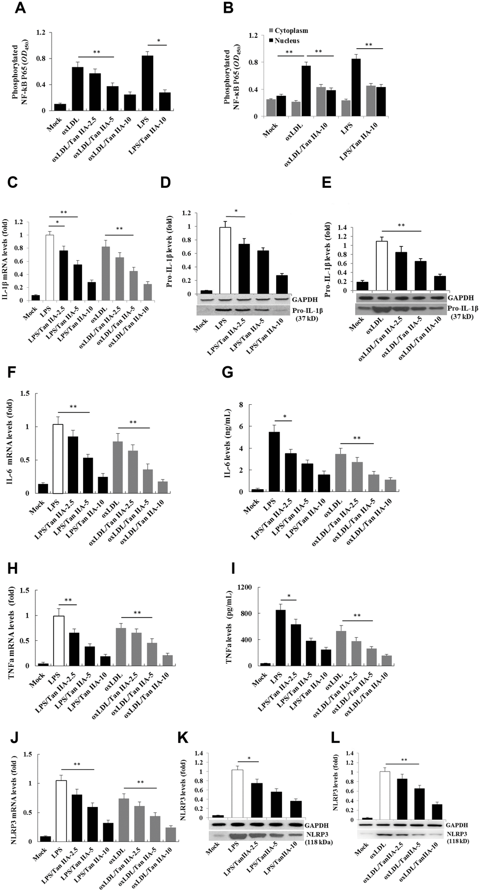 Two signals are required for the production of biologically active IL-1β: the NF-κB-mediated priming signal for pro-IL-1β and NLRP3 expression, and Nod-like receptor-mediated activation signal for IL-1β maturation/release [19, 20, 18]. To test whether Tan IIA inhibits the priming step, the immortalized bone marrow-derived macrophages from C57BL/6 mice (hereafter referred as B6 macrophages) were pretreated with different doses of Tan IIA, followed by stimulation with LPS for 6 h or oxLDL for 24 h. We found that LPS and oxLDL induced NF-κB P65 phosphorylation in the cells and nucleus (Figure 2A, 2B) and subsequent upregulation of pro-IL-1β (Figure 2C–2E), IL-6 (Figure 2F, 2G), TNFα (Figure 2H, 2I) and NLRP3 (Figure 2J–2L) expression. These results suggest that oxLDL can activate both signals for inflammasome activation, while the Tan IIA strongly inhibited the priming signal by preventing NF-κB activation.
