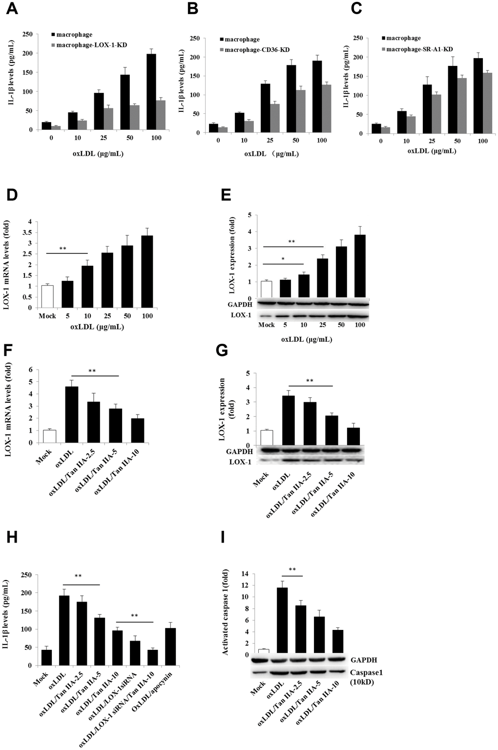 Next we investigated whether Tan IIA regulates LOX-1. To this end, we pretreated WT and LOX-1-KD macrophages with Tan IIA and then stimulated them with oxLDL. As shown in Figure 3D and 3E, oxLDL potently induced LOX-1 expression in a dose-dependent manner—an effect that was inhibited by Tan IIA pretreatment (Figure 3F, 3G). Importantly, we found that Tan IIA also inhibited the release of IL-1β from macrophages (Figure 3H), and reduced caspase 1 activation (Figure 3I), indicating that Tan IIA can inhibit oxLDL-induced LOX-1-mediated inflammasome activation.