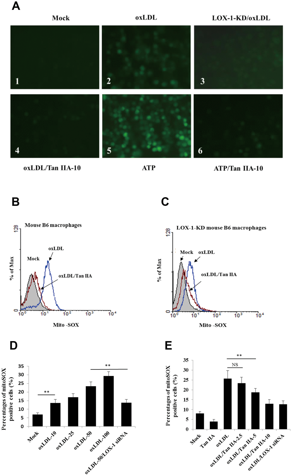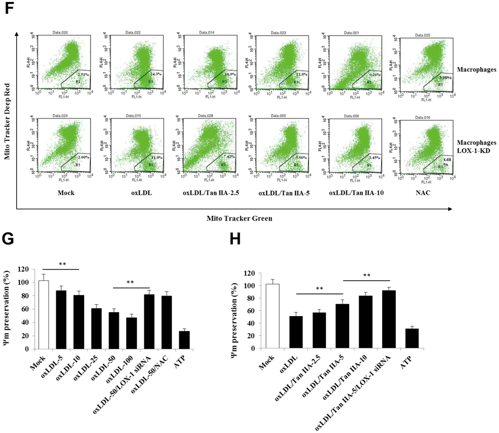 (E) Inhibition of Tan IIA on oxLDL-induced mito-ROS production in the B6 macrophages. (F) The oxLDL-induced mitochondria damage and Tan IIA inhibition on it in mouse B6 macrophages and LOX-1-KD macrophages. MitoTracker Deep Red for health mitochondria staining and MitoTracker Green FM for total mitochondria staining. NAC is a ROS inhibitor. (G) The oxLDL-induced mitochondrial membrane potential loss. (H) Tan IIA inhibition on oxLDL-induced mitochondrial membrane potential loss. ATP as a positive control for oxLDL-induced the loss of mitochondrial membrane potential.