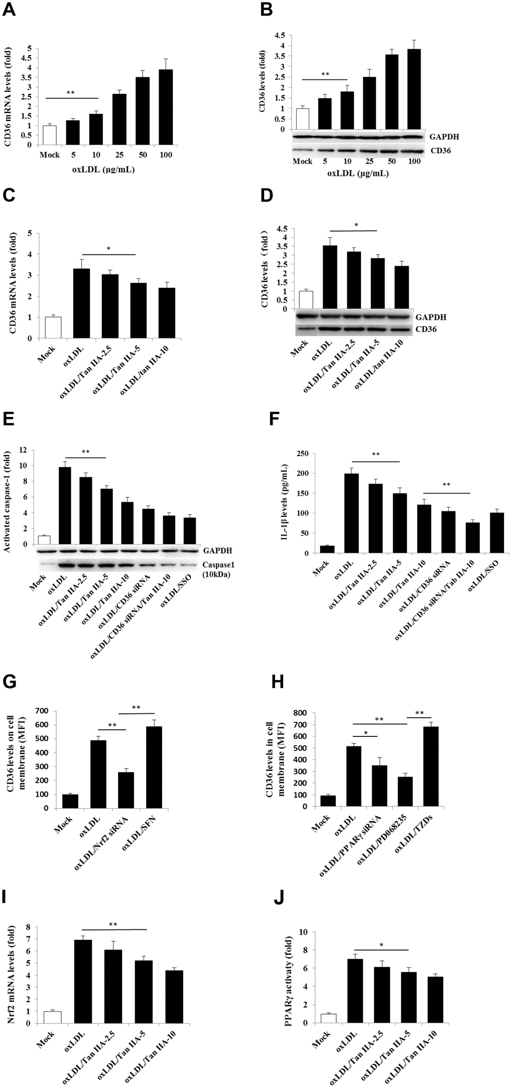 Next, we investigated the molecular mechanism by which Tan IIA attenuated oxLDL-induced CD36 expression. Two transcriptional factors—nuclear factor-E2-related factor 2 (Nrf2) and peroxisome proliferator-activated receptor-γ (PPARγ)—were shown to be responsible for inducing CD36 expression [44–47], we therefore tested whether inhibition of Nrf2 and PPARγ could reduce CD36 expression after oxLDL stimulation. Flow cytometry analyses showed that silencing Nrf2 gene by siRNA significantly inhibited oxLDL-induced CD36 expression, whereas Nrf2 activator sulforaphane (SFN) enhanced CD36 expression (Figure 5G). Similarly, inhibition of PPARγ by siRNA or its pharmacological inhibitor PD 068235 significantly inhibited oxLDL-induced CD36 expression, whereas PPARγ-agonist thiazolidinediones (TZDs) promoted oxLDL-induced CD36 expression (Figure 5H). These results suggest that oxLDL-induced CD36 expression is Nrf2- and PPARγ-dependent. Of note, we found that Tan IIA could dose-dependently inhibit oxLDL-induced Nrf2 expression and PPARγ activity (Figure 5I, 5J), thereby suppressing CD36 expression and subsequent NLRP3 inflammasome activation.