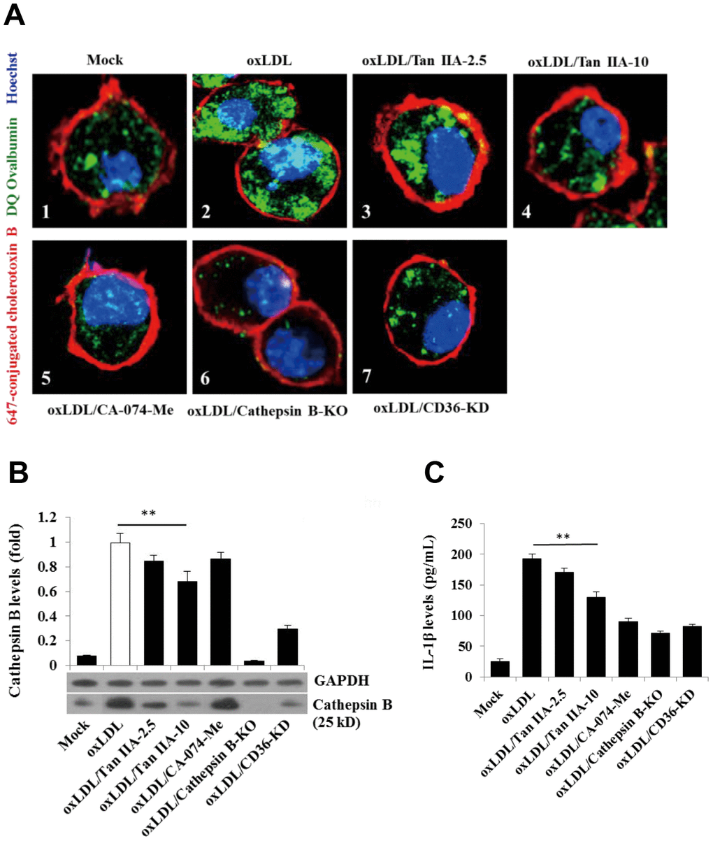 For confocal imaging assay, the cells seeded on the cover slip in 24-well plate with X-VIVO-5 medium were pretreated separately with Tan IIA, CD36 siRNA or CA-074-Me, then stimulated with oxLDL as described above. The cells were fixed with 4% polyformaldehyde (PFA) at room temperature for 30 min and incubated with 1 mg/mL 647-conjugated cholera toxin B (red) at 4° C in the dark for 1h for cell membrane staining, and then treated with 0.2% saponin/PBS solution for 20 min to increase the permeability of the membrane. Finally, the cells were incubated with 0.2 mg/mL DQ Ovalbumin for cathepsin B staining (green) and 1 μg/mL Hoechst 33342 blue dye in the dark for 1h for nuclear DNA staining. After staining, the cells were imaged immediately on confocal microscope.