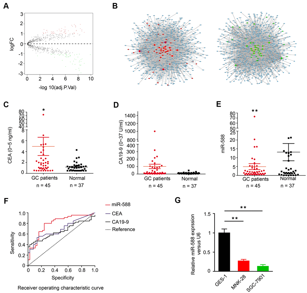 Gene Expression Omnibus (GEO) database was analyzed to determine the expression pattern of miRNAs in GC patients. As shown in the volcano map in Figure 1A, 60 upregulated miRNAs and 54 downregulated miRNAs were identified in GC (Supplementary Tables 1, 2). Analysis of the TargetScan database identified 54 downregulated miRNAs; miR-588 was shown to regulate a total of 3,728 genes by axes, including CXCL5, CXCL9, and CXCL10 (Figure 1B). We next analyzed serum levels of miR-588 and two GC markers, carcinoembryonic antigen (CEA) and carbohydrate antigen 19-9 (CA 19-9), in GC patients and healthy individuals. We found higher serum levels of CEA and CA 19-9 and lower miR-588 levels in GC patients compared with healthy individuals (Figure 1C–1E and Table 1). We further compared the areas under the curve for miR-588, CEA, and CA 19-9 and found that miR-588 had a higher sensitivity and specificity (Figure 1F). We examined miR-588 expression in several GC cell lines, including GES-1, MNK28, and SGC7901, and found miR-588 expression to be highest in GES-1 (Figure 1G).