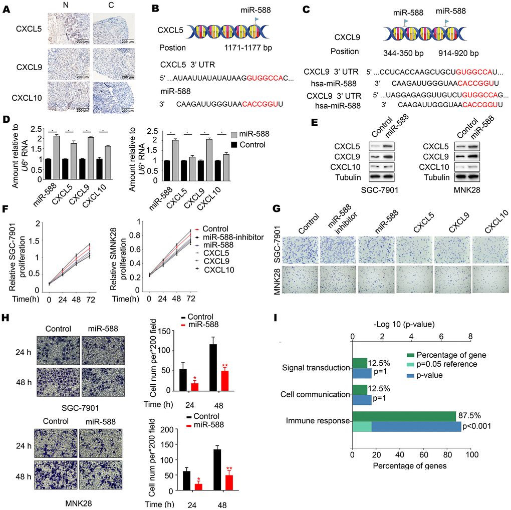 To determine the association between miR-588 and CXCL5, CXCL9, and CXCL10, levels of CXCL5, CXCL9, and CXCL10 were measured in GC tumor tissues and corresponding nontumor adjacent gastric tissues. Immunohistochemistry staining showed abundant and uniform expression of CXCL5, CXCL9, and CXCL10 proteins in nontumor adjacent gastric tissues (N), but expression of these proteins was significantly downregulated in all tumor samples (C) (Figure 2A and Table 2). Analysis using the miRWalk database showed that miR-588 directly binds to CXCL5 at the 1171-1177 bp site and to CXCL9 at the 344-350 and 914-920 bp sites (Figures 2B, 2C). We next analyzed the interactions between CXCL5, CXCL9, and CXCL10 using STRING. As shown in Figure 2C, CXCL10 was found to interact with CXCL5 and CXCL9, which indicated that there may be an interaction between miR-588 and CXCL10. Real-time reverse transcription polymerase chain reaction (RT-PCR) analysis revealed significantly increased expression of CXCL5, CXCL9, and CXCL10 in MNK28 and SGC7901 cells after transfection with miR-588 mimics compared with mimic negative control (NC)-transfected cells (P < 0.05, Figure 2D). These results were consistent with changes in protein expression of CXCL5, CXCL9, and CXCL10 (Figure 2E). Moreover, proliferation of MNK28 and SGC7901 cells was significantly decreased after transfection with GV268-miR-588/CXCL5/CXCL9/CXCL10 (Figure 2F). In addition, crystal violet staining results were consistent with those of an MTT assay (Figure 2G; statistical analysis shown in Supplementary Figure 1). Overexpression of miR-588 significantly decreased the metastatic capacity of MNK28 and SGC7901 cells (Figure 2H). Remarkably, a functional enrichment analysis using the FunRich database showed that CXCL5, CXCL9, and CXCL10 function was mainly related to immune response (Figure 2I).