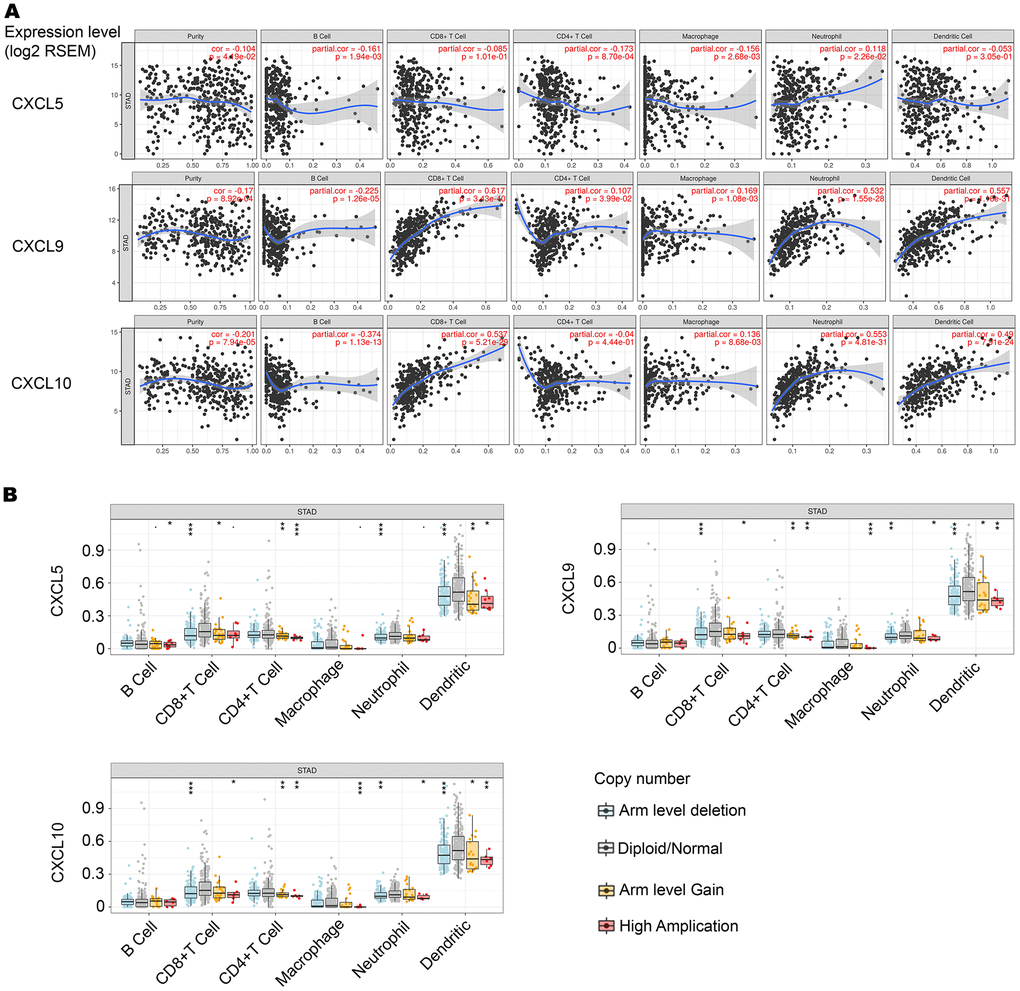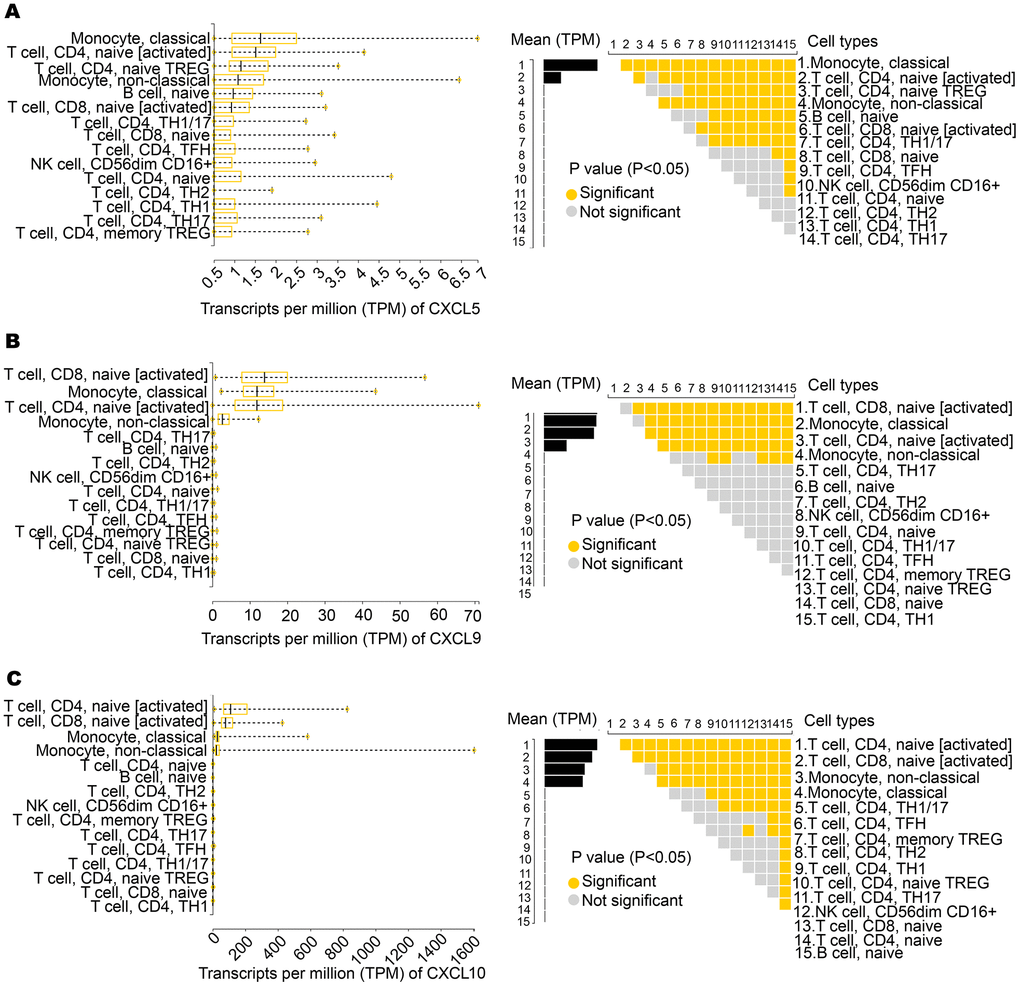 We further analyzed the expression of CXCL5, CXCL9, and CXCL10 in various immune cells. According to an analysis of the Database of Immune Cell Expression (DICE), CXCL5 is highly expressed in immune cells, including CD4+ and CD8+ T cells and monocytes (Figure 3A). As shown in Figures 3B, 3C, CXCL9 and CXCL10 were highly expressed in CD8+ and CD4+ T cells.