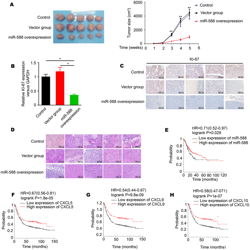 We investigated whether miR-588 was involved in proliferation of CG cells. Nude mice were divided into three groups: a control group, a vector group, and an miR-588 overexpression group; mice were injected subcutaneously (n = 5 per group). Tumor size was measured every 7 days after injection. Whole tumors were excised on the 35th day. Resected tumors from the miR-588 overexpression group were significantly smaller than those from the control and vector groups (Figure 5A). RT-PCR analysis revealed significantly decreased expression of Ki-67 in the miR-588 overexpression group (P < 0.05, Figure 5B), which was consistent with Ki-67 protein expression determined using immunohistochemistry (Figure 5C). Furthermore, there was little distinction between the three groups after staining with hematoxylin-eosin (Figure 5D). To investigate whether miR-588, CXCL5, CXCL9, and CXCL10 are associated with prognosis in patients with GC, we mined the largest-scale survival-related clinical data sets from Kaplan-Meier Plotter (http://kmplot.com/). We found that high expression of miR-588, CXCL5, CXCL9, and CXCL10 was significantly associated with longer overall survival of GC patients (P < 0.05, Figures 5E–5H).
