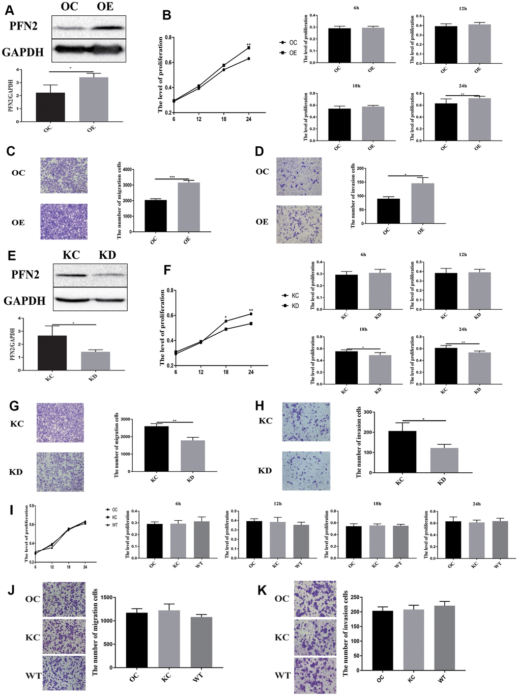 To explore whether PFN2 plays a role in SCLC tumorigenicity and metastasis, we first established the H446 cell line stably overexpressing PFN2 (referred to as H446-OE) compared to control cells (Figure 2A). We then examined the effect of PFN2 on cellular biological functions. The MTT and transwell assays indicated that PFN2 overexpression (OE) significantly increased proliferation, migration and invasion in H446 cells (Figure 2B–2D). Meanwhile, PFN2 knockdown in H446 cells (referred to as H446-KD) was also established, in which PFN2 was significantly reduced compared to that in the control line (Figure 2E). PFN2 knockdown significantly inhibited proliferation, migration, and invasion in H446 cells (Figure 2F–2H). Comparison tests showed that the OE control (H446-OC), knockdown control (H446-KC), and the wild type (H446-WT) of H446 cells had similar results (Figure 2I–2K), implying no influence of the respective modifications of H446 cells on their proliferation, migration, and invasion abilities. These results indicate that PFN2 significantly promotes the growth and invasion of SCLC cells.