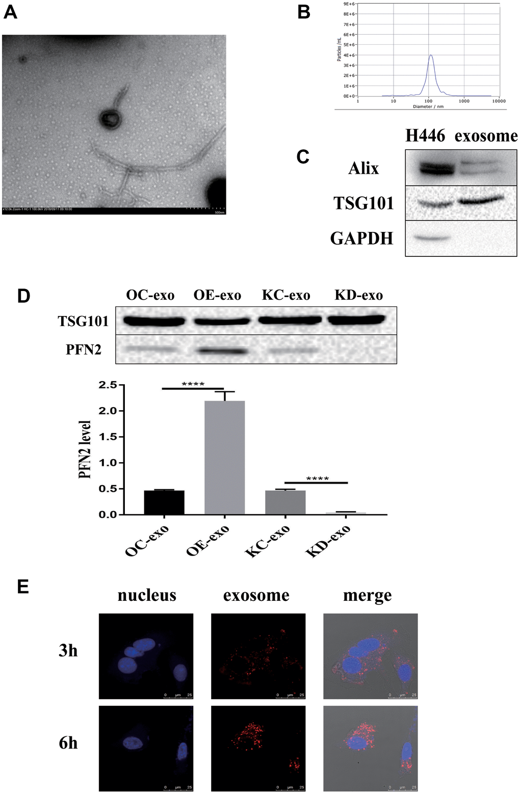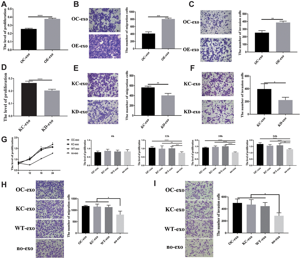 Considering that PFN2 is a cytoskeleton regulatory protein, we hypothesized that PFN2 could be loaded on exosomes. To test this, we collected the culture medium of H446-OE and H446-KD and isolated exosomes by ultracentrifugation. The presence of exosomes was confirmed by electron microscopic detection (Figure 3A), nano-transforming analysis (Figure 3B), and western blotting (Figure 3C). As shown in Figure 3A, 3B, the average size and diameter of the exosomes secreted by H446 were 100 nm, and most diameters ranged from 80 nm to 110 nm, which was consistent with findings of previous report [21]. Western blot analysis showed that the exosome markers of Alix and TGS101 were expressed (Figure 3C). Meanwhile, the exosomes from H446-OE (H446-OE-exo) harbored significantly higher PFN2 levels, whereas those from H446-KD (H446-KD-exo) displayed lower PFN2 expression than those in their corresponding control (Figure 3D). We labeled (PKH26, red) H446-derived exosomes (referred to as H446-exo) to test whether exosomes could be internalized by H446 cells. As expected, H446-exo was internalized by H446 cells within 3 h (Figure 3E). Lastly, we tested the impact of H446-OE-exo and H446-KD-exo on SCLC cell biological function. We found that compared with the corresponding control exosomes, H446-OE-exo dramatically increased the proliferation, migration, and invasion of SCLC cells (Figure 4A–4C), whereas H446-KD-exo significantly inhibited the proliferation, migration, and invasion (Figure 4D–4F). Moreover, we found that exosomes from H446-OC, H446-KC, and H446-WT had similar function in promoting the proliferation, migration, and invasion abilities of H446 cells, which were significantly enhanced compared with those in the group of control cells non-treated with exosomes (no-exo) (Figure 4G–4I). All these data strongly demonstrate that exosomal PFN2 significantly participates in SCLC biological functions.