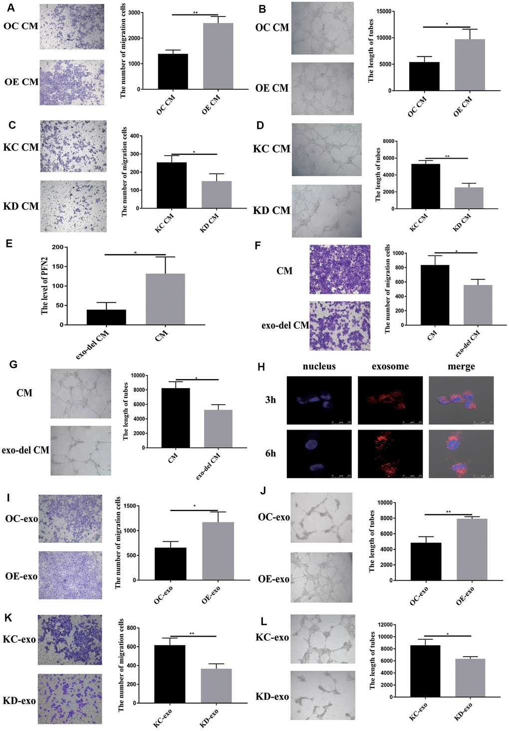 To examine whether exosomes from SCLC affect EC angiogenesis, we cultured HUVEC cells in H446-OE or H446-KD conditioned medium (CM) or exosome-depleted CM. The results demonstrated that H446-OE-CM significantly increased the migration and tube length of HUVEC cells compared to H446-OC-CM (Figure 5A, 5B), whereas H446-KD-CM significantly inhibited the migration and tube length of HUVEC cells compared to H446-KC-CM (Figure 5C, 5D). We removed the exosomes from the CM and found that PFN2 expression in the CM was significantly decreased (Figure 5E), which indicated that PFN2 was mainly loaded by the exosomes. When cultured with exosomes depleted H446 CM, the migration and tube length were attenuated in HUVEC cells (Figure 5F, 5G). These results demonstrated that PFN2 is the critical factor contributing to HUVEC cells angiogenesis via exosomes. Then, we investigated whether the exosome secreted from H446 could be internalized by ECs. The results showed that H446-exo was taken up by ECs in a time-dependent manner and reached a maximum level after 6 h (Figure 5H). Thus, we examined the effect of H446-OE-exo and H446-KD-exo on HUVEC cell biological function. As expected, the migration and tube lengths of HUVEC cells were significantly higher in the H446-OE-exo group (Figure 5I, 5J) and lower in the H446-KD-exo group (Figure 5K, 5L) compared to those in their corresponding controls. Our data indicate that exosomes from SCLC cells overexpressing PFN2 enhance the angiogenesis ability of ECs.
