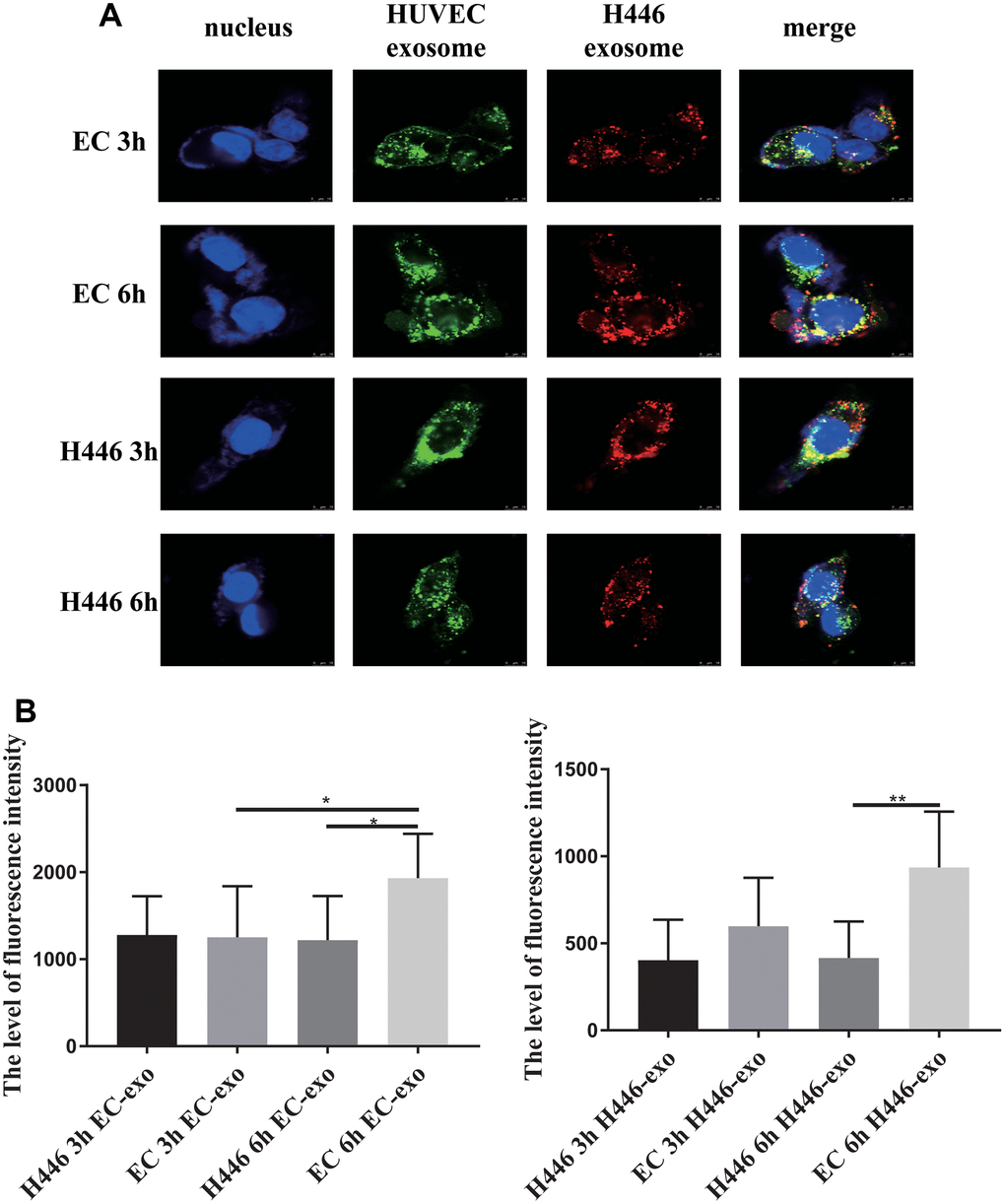 To deeply understand exosome mediated cross-talk between ECs and SCLC cells, we explored whether there were differences in SCLC cells or ECs as recipient cells to internalize exosomes from different origins of cells and whether there was a specificity or superiority when the SCLC cells and ECs internalized exosomes derived from themselves. We labeled exosomes derived from SCLC cells with PKH26 (red) and those derived from ECs with PKH67 (green) and mixed them in equal proportion. Next, SCLC cells and ECs were treated with mixed-labeled exosomes. In this experiment, we found that H446 could internalize exosomes from H446 and ECs, and the amount of exosomes internalized by H446 at 2.5 h was similar to that at 3 h. In contrast, ECs could internalize more exosomes at 3 h than at 2.5 h (Supplementary Figure 2). After co-culturing for 3 h or 6 h, we detected the amount of exosomes internalized in SCLC cells and ECs, respectively. As shown in Figure 6A, 6B, both H446 and HUVEC cells demonstrated similar uptake of exosomes after 3 h of incubation. However, at the 6 h test end time-point, H446 cells had lesser intake of both H446-exo and EC-exo than ECs. These results indicated that although there was no significant specificity for SCLC cells and ECs when they internalized exosomes, ECs could internalize more exosomes than SCLC cells.
