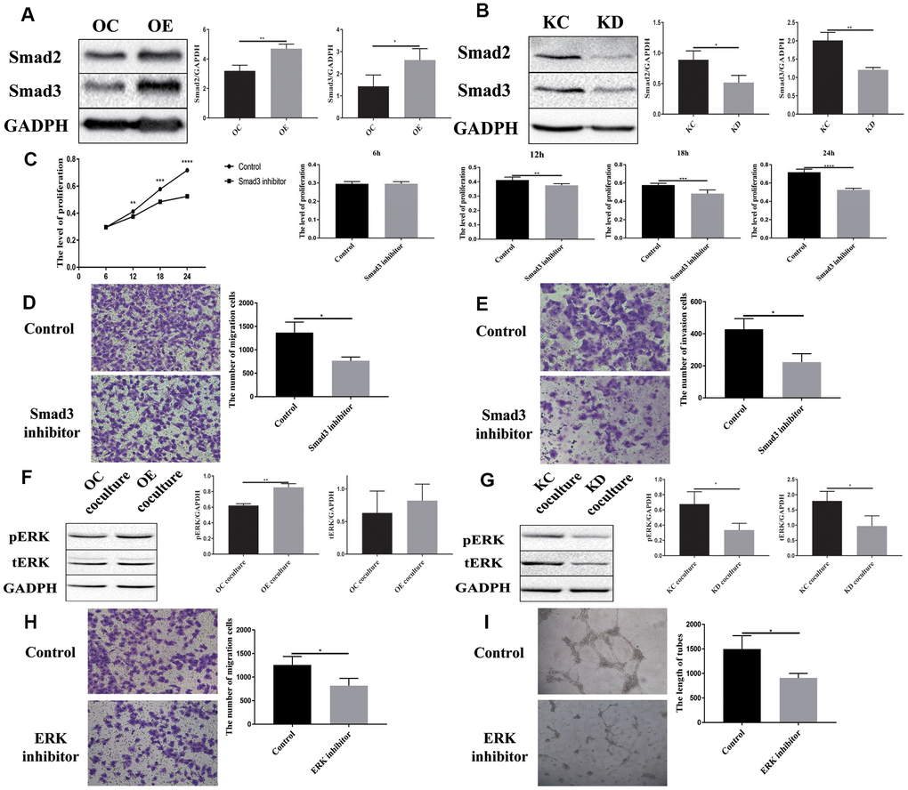 Previous studies revealed that the MAPK/ERK pathway plays a crucial role in VEGF-mediated angiogenesis [22, 23]. We detected ERK phosphorylation in ECs co-cultured with SCLC cells. After co-culturing with H446-OE, ERK phosphorylation (pERK) in ECs was remarkably increased compared to that in cells co-cultured with H446-OC, whereas after co-culturing with H446-KD, pERK in ECs decreased compared to that in cells co-cultured with H446-KC (Figure 7F, 7G). However, PI3K, AKT, p-AKT, Smad2, and Smad3 expression exhibited no difference among ECs co-cultured with OE-H446, OC-H446, KD-H446, and KC-H446 (Supplementary Figure 3). We also found that an ERK inhibitor (SCH772984) could impede the function of PFN2 in promoting the migration and tube formation ability of ECs (Figure 7H, 7I). These data indicate that PFN2 enhances EC angiogenesis through the MAPK/ERK pathway.