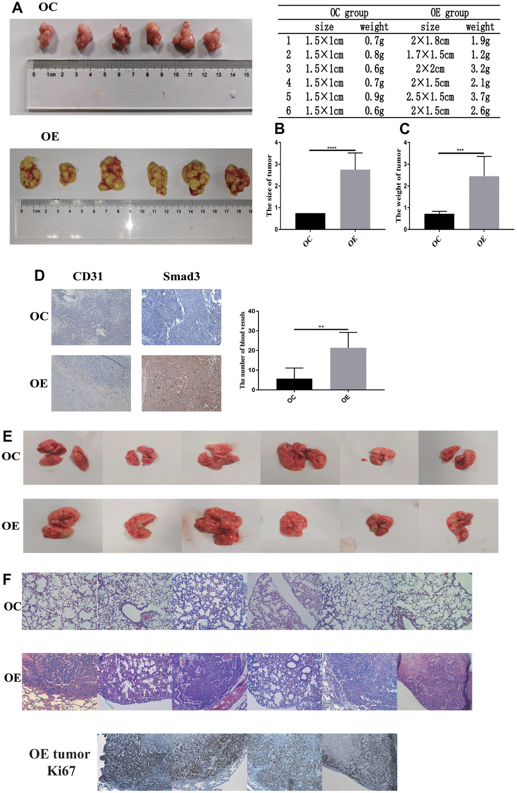 To further validate the function of PFN2 in SCLC in vivo, CB17-SCID mice were subcutaneously injected with H446-OE or H446-OC. Both size and weight of tumors in SCID mice were significantly higher in the H446-OE group than in the H446-OC group (Figure 8A–8C). Consequently, we detected CD31 expression to evaluate the number of blood vessels in the tumors. The results revealed that the tumors of the H446-OE group harbored significantly more blood vessels than those of the H446-OC group (Figure 8D). Smad3 expression was higher in the H446-OE group than in the H446-OC group (Figure 8D). These results showed that PFN2 promoted the tumor growth of SCLC by upregulating Smad3 and increasing angiogenesis in the tumors.