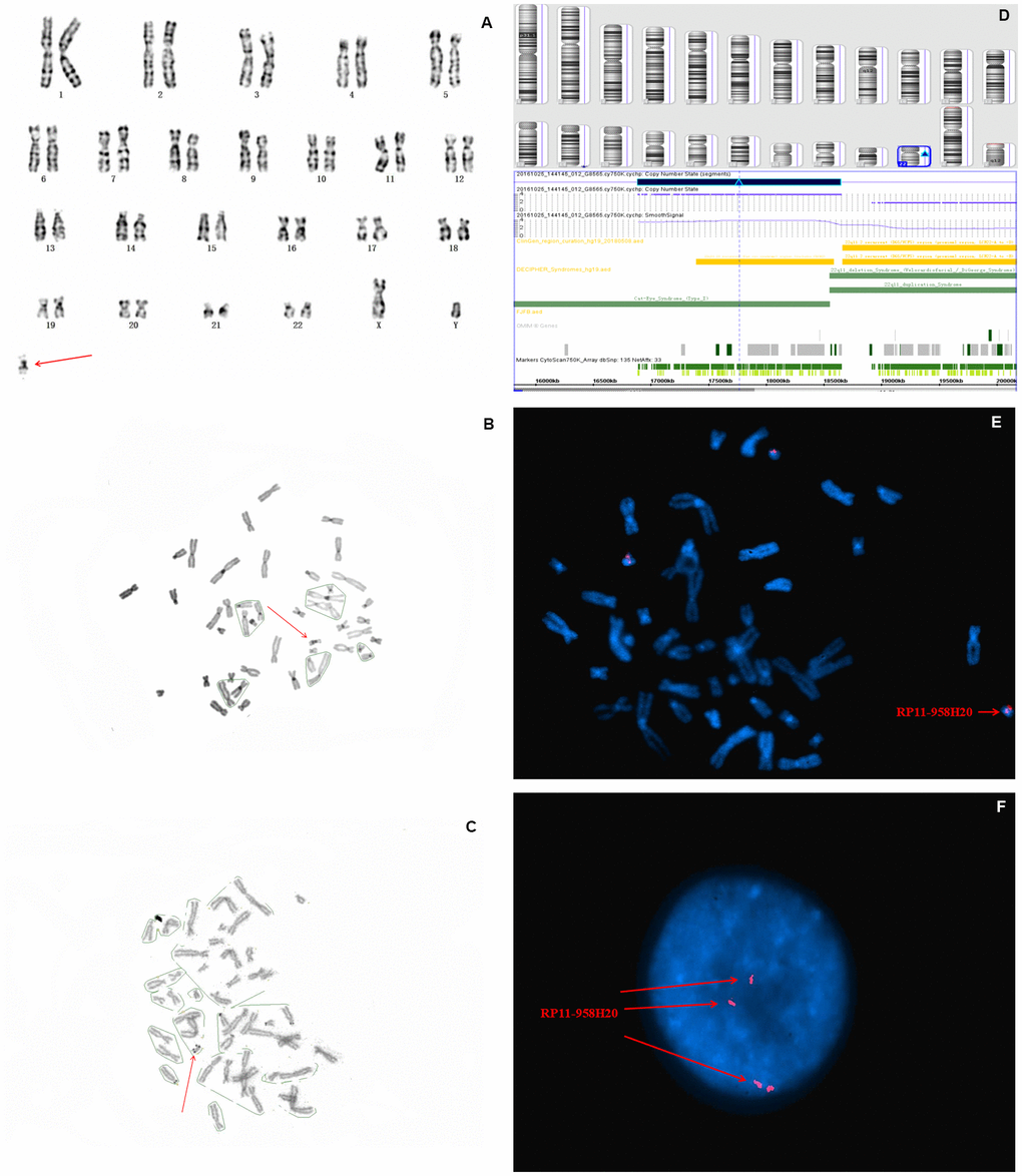 Generally, conventional cytogenetic banding can only detect sSMCs, while determining the precise origin of the sSMC is challenging. sSMC frequencies have been reported to differ according to the population group studied [2]. Moreover, patients with sSMCs vary greatly as the phenotypic differences are closely related to chromosome origin, gene content, size, degree of mosaicism, presence of uniparental disomy, and distribution pattern of the sSMC in different tissues. Considering that the risk of phenotypic abnormalities in fetuses with sSMCs is 13% [5], the precise characterization of sSMCs is crucial for prenatal diagnosis and genetic counseling. However, identifying the genotype–phenotype correlations is challenging in prenatal diagnosis, particularly for de novo sSMCs. Nevertheless, FISH has proven essential for this purpose, even with the recent boom in microarray techniques. Furthermore, SNP array is routinely applied for the detection of chromosomal submicroscopic deletion/duplication, UPD as well as for prenatal identification of sSMCs [6]. In fact, it serves to supplement cytogenetic analysis in genetic counseling, as well as in evaluating the prognosis of fetuses with sSMCs. Hence, SNP arrays combined with FISH technologies can greatly reduce prognostic uncertainty while providing critical information that helps couples to choose whether to continue or terminate the pregnancies.