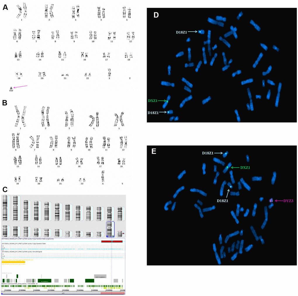 Amniotic fluid or fetal cord blood sample was obtained according to the invasive procedure protocol. Routine cytogenetic analysis by G-banding (C/NOR-banding when necessary) technique was performed according to standard laboratory protocols and ISCN 2016. Briefly, 20 mL of amniotic fluid was collected and subjected to in situ amniocyte culture. Parental blood samples were also collected for cytogenetic analyses. Amniocyte in situ culture and harvest, as well as G-banding were performed. Fifteen primary colonies were examined. If the available number of the primary colonies was fewer than 15, a total of 20 cells from both primary and trypsinized cultures were examined.
