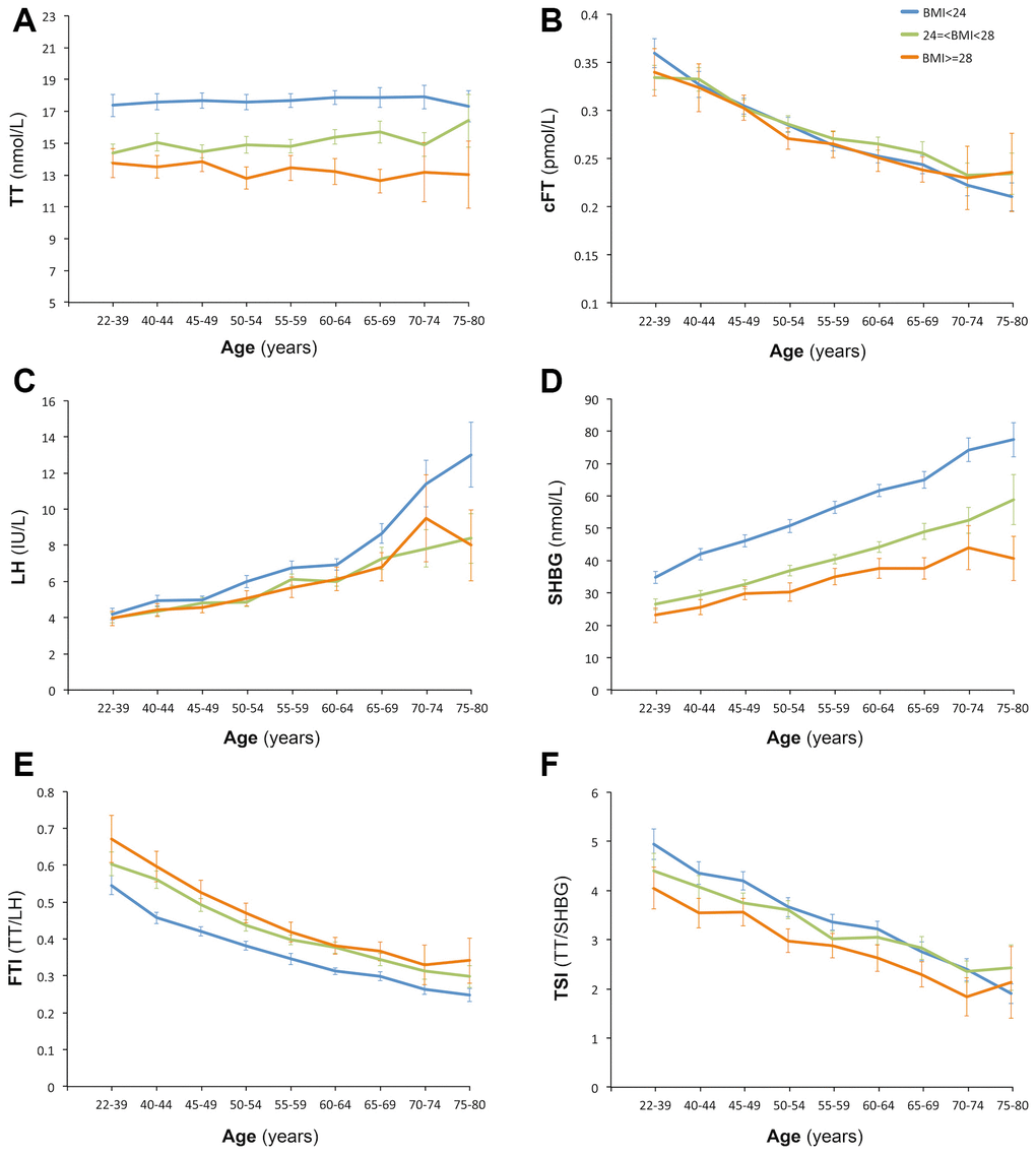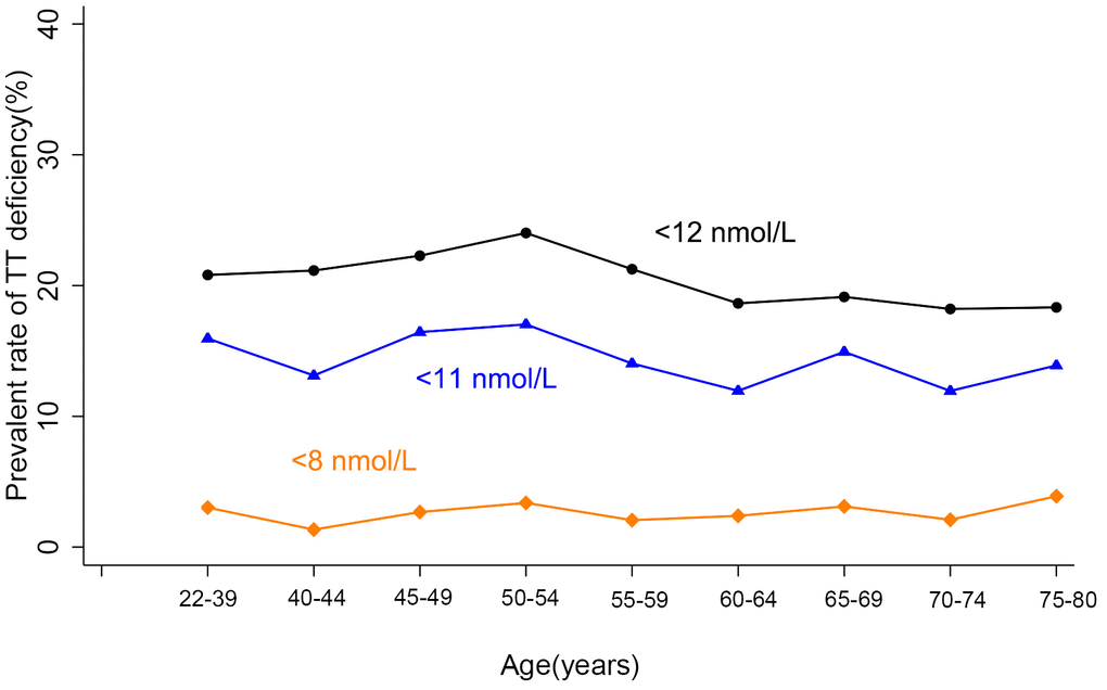 Age trends of hormones of all participants were analyzed with three categories of BMI according to the standards for Chinese population: less than 24 kg/m2 (normal), 24 or greater to less than 28 kg/m2 (overweight), and ≥28 kg/m2 (obese) [13]. Serum TT showed significant difference among the three BMI categories (Supplementary Table 1) and a little fluctuation with aging, whereas no age trend was observed (Figure 1A). Considering some factors may influence TT and conceal the age trend of TT level. Potential factors associated with TT levels were further screened using stepwise multiple linear regression. BMI, residence, smoking, alcohol-drinking, and marital status, were found to be correlated with TT levels, whereas age was not after removing effects of these listed factors (Supplementary Table 2) in our population. We further analyzed the occurrence of several proposed abnormal TT levels (below 8, 11, and 12nmol/L, respectively) with aging [1, 2], and no age trend was observed (Figure 2).