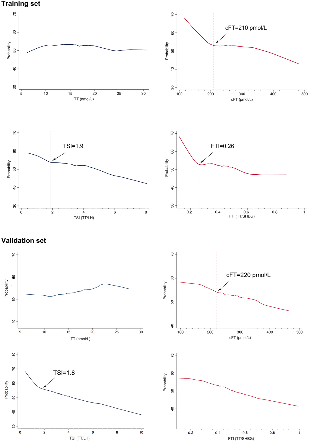 The cAMS score of 17 was used to classify aging men in the training set into symptomatic and asymptomatic subjects. The trend of the probability of symptom along with the change of cFT, FTI, TSI, TT was further analyzed by Lowess smoothing. Increases of the probability of symptom were observed with decreased cFT, FTI, and TSI, but not with TT (Figure 3). In the training set, thresholds for the significant increase of the probability of symptom were approximately 210 pmol/L for cFT, 0.26 for FTI, and 1.9 for TSI, while no threshold was found for TT. In the validation set, similar results were obtained, with thresholds of 220 pmol/L for cFT, and 1.8 for TSI. The thresholds of cFT and FTI were further identified by piecewise repression in both the training set and the validation set. Consistent results were obtained for cFT<210 pmol/L and TSI<1.8 in these two sets (Table 2).