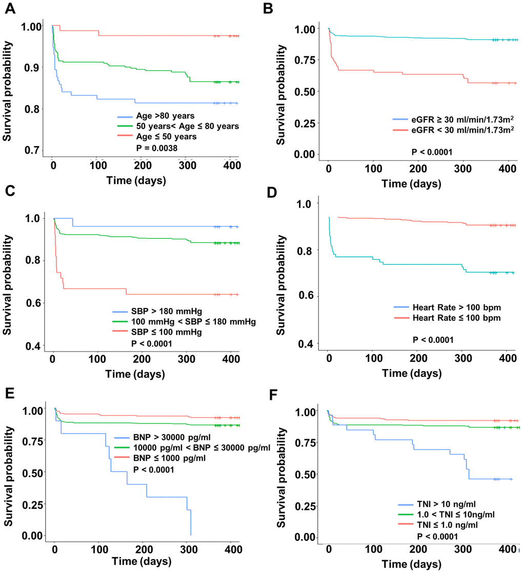 The C-index for the final analysis was used to estimate and compare different variables. log-rank test was used for comparison. Variables that achieved significant P < 0.05 were entered into the multivariable Cox regression analyses. A final model was selected using a backward step-down process [4, 5]. The final model included six predictors as follows, age, estimated glomerular filtration rate (eGFR), SBP, heart rate (HR), brain natriuretic peptide (BNP), and cardiac troponin I (TNI). Hazard ratios (HR) of the predictors for 1-year mortality were calculated and listed in Table 2.