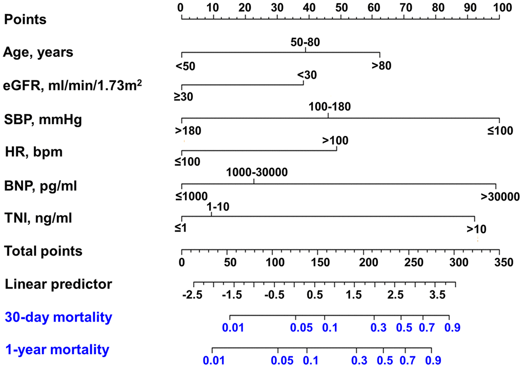 AMI is a common severe disease, causing a tremendous medical burden on patients, their families, and the society. Early assessment of the prognosis of the disease is particularly critical [11, 12]. In this study, we constructed a predictive model for 30-day and 1-year mortality in AMI patients receiving interventional therapy. A nomogram was developed for clinicians to assess preoperatively short-term prognosis of the disease, and further provide guidance on early preventive measures. Our model included 6 variables: age, TNI, eGFR, SBP, heart rate, and BNP as primary predictors. These variables are easy to obtain in the early stage of admission, so that it is more convenient for clinicians to use and carry out early risk assessment.