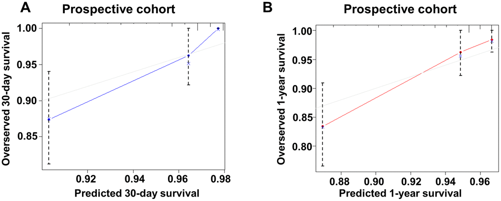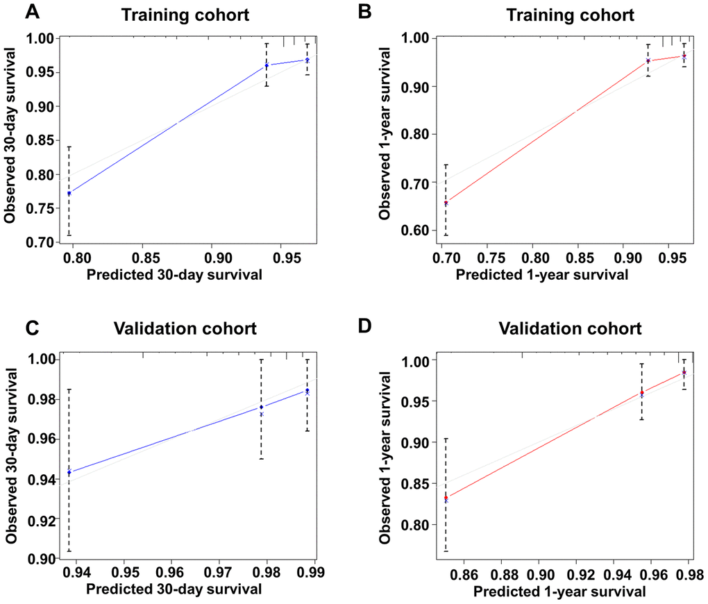 For nomogram model of 30-day mortality, calibration curves of the training group and the validation group were shown in Figure 3A and 3C. And for nomogram model of 1-year mortality, the calibration curves of the training cohort and the validation cohort were shown in Figure 3B and 3D. Together, these results suggest a good fit for our model.