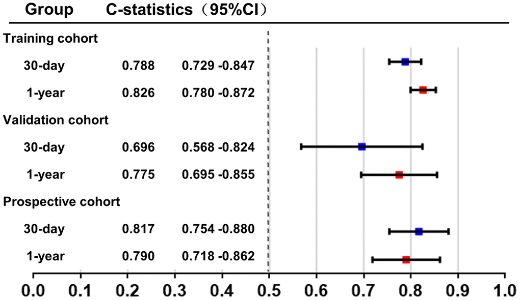 The C-index for the final 30-day mortality generated by bootstrap validations was 0.788 (95% CI: 0.729 - 0.847) in the training group and 0.696 (95% CI: 0.568 - 0.824) in the validation group. Moreover, the C-index for 1-year mortality in the training group and the validation cohort was 0.826 (95%CI: 0.780 - 0.872) and 0.775 (95%CI: 0.695 - 0.855), respectively (Figure 4). C-index of GRACE risk score for 30-day mortality was 0.762 (95% CI: 0.698 - 0.826) and for 1-year mortality was 0.722 (0.662 - 0.782) in training group. These results showed a good discrimination of the nomogram models.