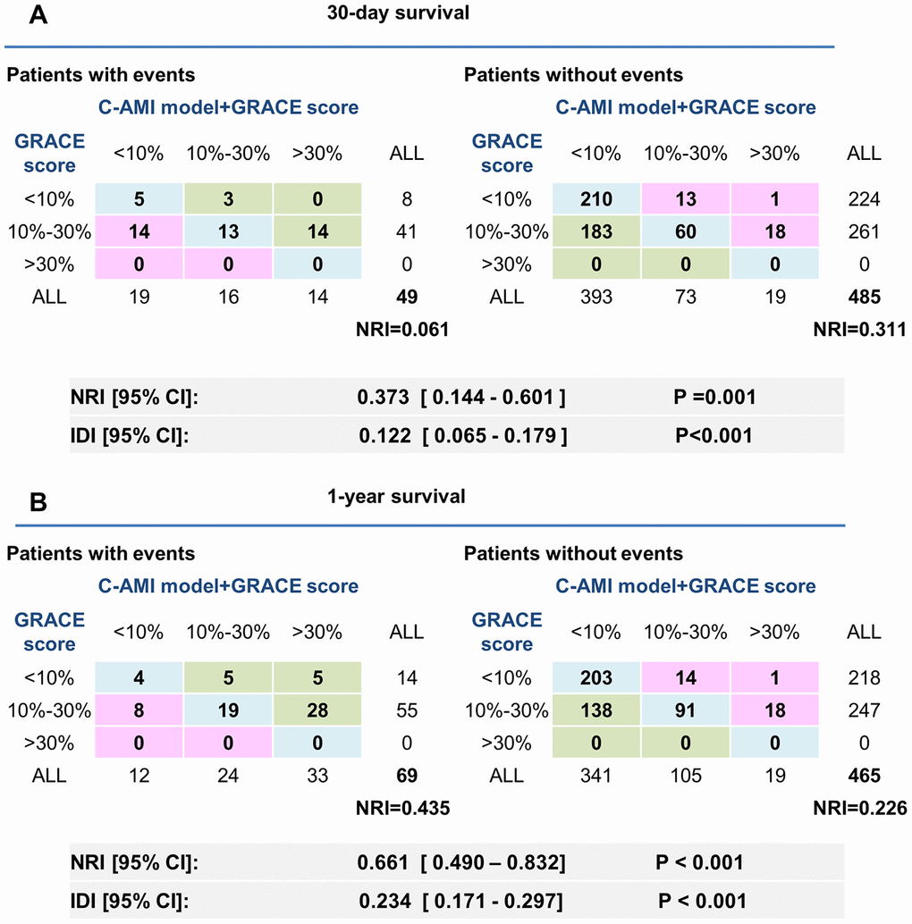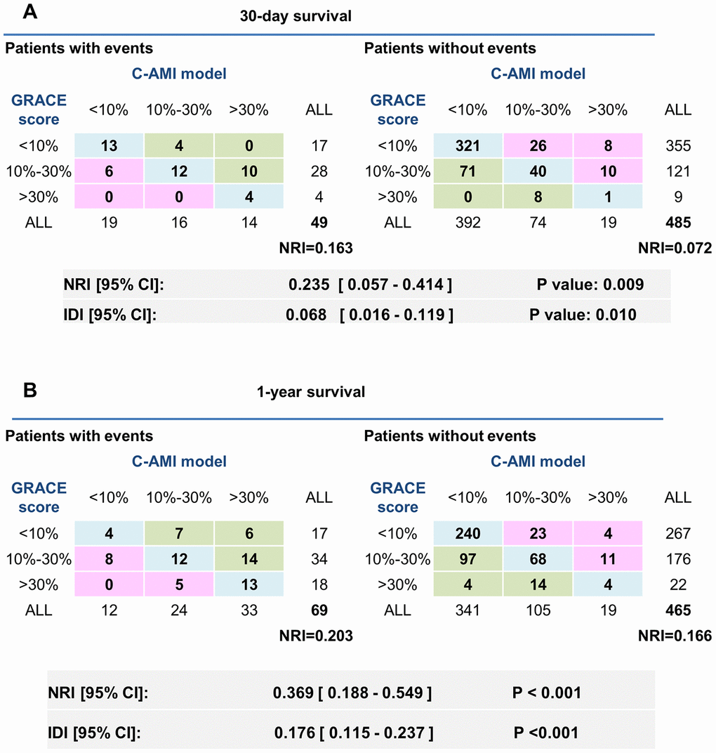 In the training cohort, we also calculated the GRACE score of each patient, and then made comparisons between the risk estimated by our C-AMI model and that by the GRACE score. First, net reclassification improvement (NRI) was calculated in the training cohort. Based on the previous studies [6], we used 10% and 30% as thresholds to define the risk grade of patients at low (<10%), intermediate (10 - 30%), and high risk (>30%), C-AMI model achieved an NRI of 23.5% as compared with the GRACE risk score (<10% as low risk, 10 - 30% as moderate risk, and 30% as highest risk) for predicting 30-day mortality (Figure 5A). In 49 patients with events within 30 days, 14 patients were correctly reclassified into a higher risk category by C-AMI model. On the other hand, 6 patients out of 49 were incorrectly reclassified to lower risk categories by GRACE risk score. Moreover, C-AMI model achieved an NRI of 36.9% as compared with the GRACE risk score for predicting 1-year mortality (Figure 5B). In 69 patients with events within 1 year, 27 patients out of 69 were correctly reclassified into a higher risk category by C-AMI model. On the other hand, 13 patients out of 69 were incorrectly reclassified to lower risk categories by GRACE risk score. The integrated discrimination improvement (IDI) are also listed in Figure 5. IDI showed a significant improvement in the accuracy generated by the C-AMI model when compared with the GRACE score. These results indicate that C-AMI model has better performance in predicting mortality than GRACE score.