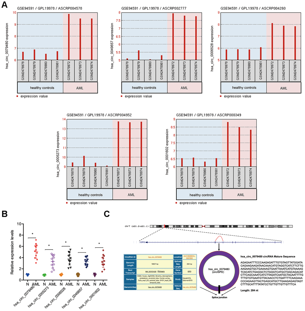The circRNA (GSE94591) expression profile was assessed by GEO2R to find out the role of circRNAs in AML and the top 5 upregulated circRNAs (hsa_circ_0079480, hsa_circ_0049657, hsa_circ_0006528; hsa_circ_0005273, and hsa_circ_0001602) (Figure 1A) were studied. Afterwards, expressions of 5 circRNAs in 12 BM samples from AML patients were explored. Results of qRT-PCR indicated that in BM samples, expression of hsa_circ_0079480 was maximally upregulated among the 5 circRNAs (Figure 1B). Hsa_circ_0079480 is located in chr7:16298014-16317851, which is spliced from the ISPD gene, which the ultimate length of 284 nt (Figure 1C).