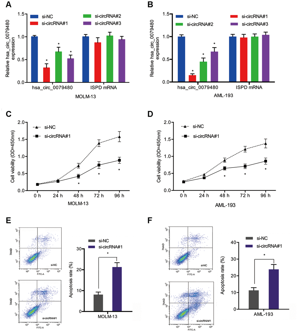 Loss-of-function experiments were performed by transfection of si-circ0079480 (si-circRNA) was into AML cells to identify the oncogenic role of hsa_circ_0079480 in AML. Additionally, qRT-PCR was carried out to identify the knockdown efficiency of si-circRNA (Figure 3A, 3B). CCK-8 assay demonstrated that viability of MOLM-13 and AML-193 cells was lower in si-circRNA knockdown group in comparison to the controls (si-NC) (Figure 3C, 3D). From flow cytometry assay we can see the AML cells apoptosis rate was markedly increased by hsa_circ_0079480 knockdown (Figure 3E, 3F). The data confirmed the tumor promoter functions of hsa_circ_0079480 in AML advancement.