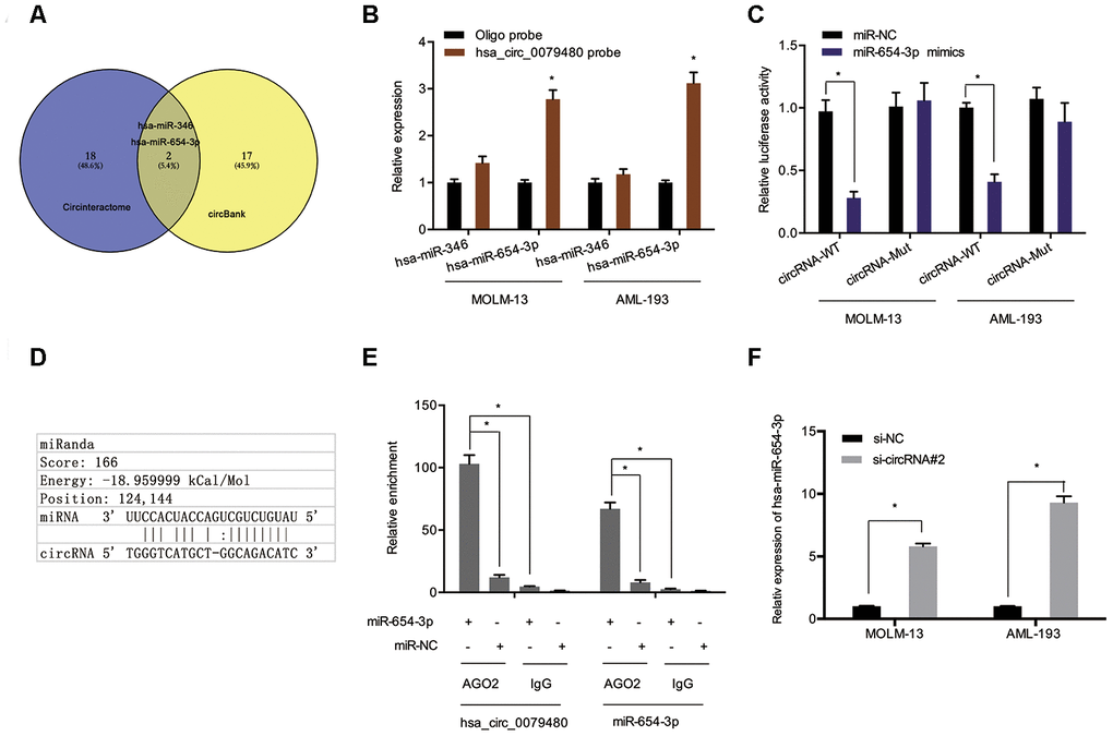 Herein, we also identified that miR-654-3p was decreased in AML, and low expression was linked to poor disease outcomes. Next, functional assays showed that miR-654-3p mimics suppressed growth and induced apoptosis of AML cells. Moreover, luciferase reporter and RIP assays further demonstrated that hsa_circ_0079480 could directly interact with miR-654-3p in AML. Thus, we demonstrated that hsa_circ_0079480 may have a role as a sponge of miR-654-3p in AML development.