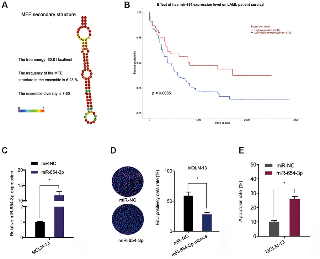 Next, the we explored the expression and potential function of miR-654-3p in AML. TCGA data indicated an association between poor OS of AML patients and reduced miR-654-3p levels (Figure 5A and 5B). Subsequently, the function of miR-654-3p in AML cells was evaluated via transfecting miR-654-3p mimics (Figure 5C). EdU assay suggested that high expression of miR-654-3p substantially hindered the proliferation of MOLM-13 cells in comparison to the negative control (Figure 5D). Apoptosis assays indicated that an increased apoptotic rate in MOLM-13 cells was associated with increased levels of miR-654-3p (Figure 5E). This data proves that hsa_circ_0079480 functions as a sponge of miR-654-3p in AML.