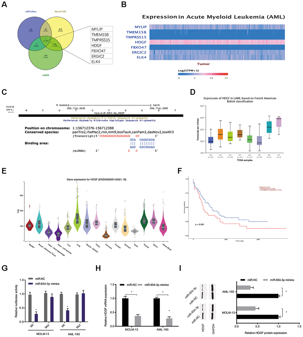 Bioinformatics analysis (miRTarBase; MicroT-CDS; miRDB [21–23]) was carried out to predict the miR-654-3p targets (Figure 6A). Among potential targets, we focused on HDGF (Figure 6B, 6C), which is known to be involved in tumorigenesis [24]. TCGA database demonstrated that HDGF levels were decreased in normal tissues and significantly increased in AML tissues (Figure 6D, 6E). High HDGF levels were related to poor OS rate in AML patients (Figure 6F). HDGF-Wt group activity was observed to be suppressed by miR-654-3p mimics through luciferase reporter assay (Figure 6G). What’s more, HDGF expression was also observed to be significantly inhibited by miR-654-3p mimics in AML cells (Figure 6H, 6I). Together, these data illustrated that miR-654-3p inversely modulated HDGF levels in AML.