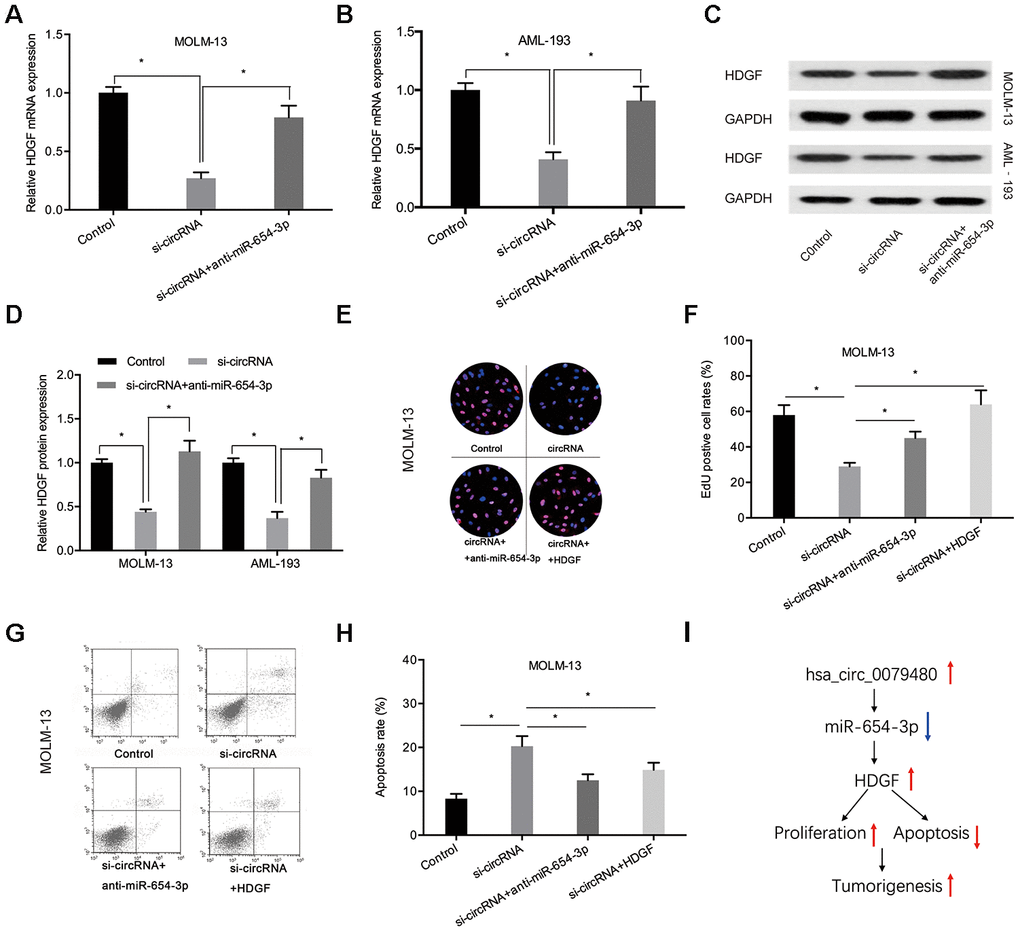 In order to verify that hsa_circ_0079480 exhibits an oncogenic influence on AML progression by modulating miR-654-3p/HDGF pathway, miR-654-3p inhibitor or HDGF overexpression plasmid (HDGF) was co-transfected using si-circ0079480 (si-circRNA). qRT-PCR and Western blot assays indicated that hsa_circ_0079480 knockdown suppressed HDGF levels and miR-654-3p inhibitors reversed its role in ALM cells (Figure 7A–7D). Next, rescue assays were utilized to confirm the hsa_circ_0079480/miR-654-3p/HDGF axis in AML. EdU assay indicated that hsa_circ_0079480 suppression hindered the viability of MOLM-13 cells in vitro, while miR-654-3p inhibitors (or HDGF overexpression) reversed these effects (Figure 7E, 7F). Moreover, si-circ0079480-induced apoptosis of MOLM-13 cells was also rescued by a miR-654-3p inhibitor (or HDGF overexpression) (Figure 7G, 7H). Thus, these data suggested that hsa_circ_0079480 encourages AML advancement via the miR-654-3p/HDGF axis (Figure 7I).