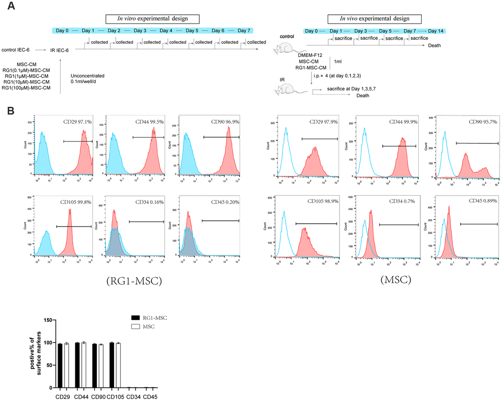 In vivo and in vitro study designs are showed in Figure 1A. To evaluate the phenotype of BM-MSCs pre-activated by RG-1, we performed flow cytometry to identify the surface markers. Similar to the phenotype of BM-MSCs in our previous study [12], flow cytometry showed that CD29, CD44, CD90, CD105 were positive while CD34 and CD45 were negative in BM-MSCs activated by RG1 (Figure 1B), suggesting BM-MSCs still maintained its phenotype after activation of RG-1.