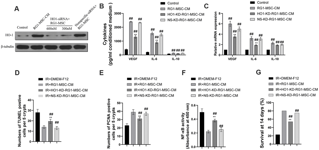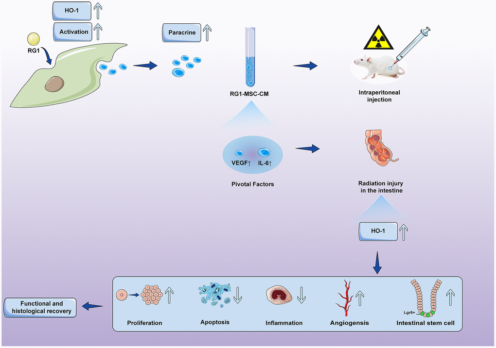 Our study confirmed the hypothesis that RG1 can enhance the paracrine effects of BM-MSCs on RIII and showed that 1) RG1-MSC-CM, but not MSC-CM, improved survival and promoted the structural and functional restoration of RIII by regulating intestinal regeneration, inflammation and angiogenesis. 2) RG1 enhanced the BM-MSCs secretion of VEGF and IL-6 therefore providing superior therapeutic efficacy on RIII. 3) the protective effect of IL-6 and VEGF on RIII is partially mediated via HO-1 dependent mechanism. 4) the superior paracrine effect of RG1-MSC is partially mediated by upregulation of HO-1.