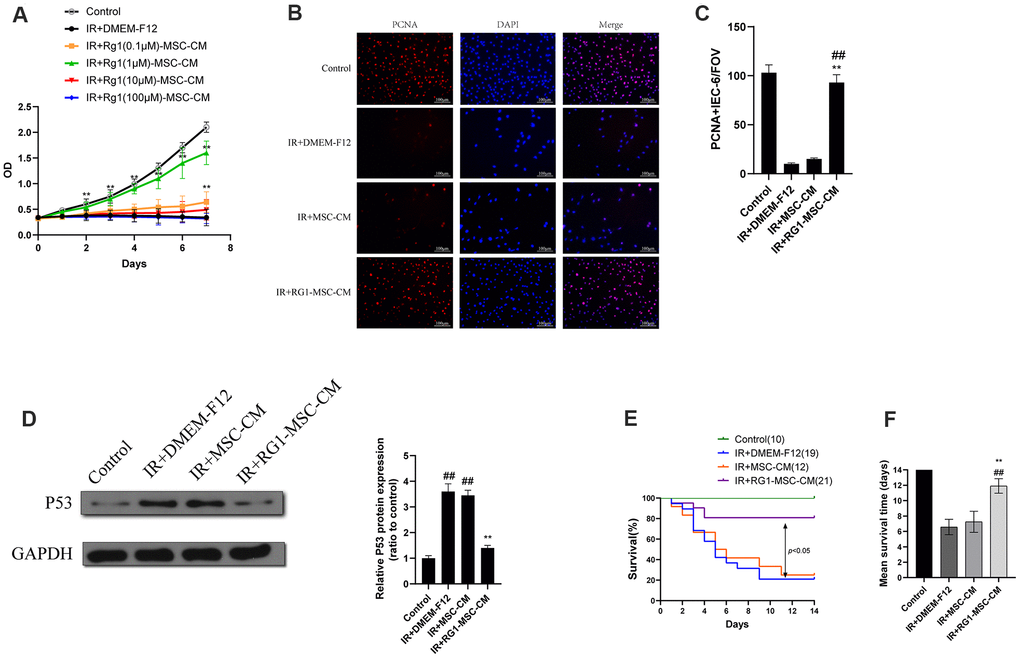 To further evaluate the effect of RG1-MSC-CM on irradiated IEC-6, we performed PCNA immunofluorescence staining on irradiated IEC-6 and evaluated the expression of p53, which is a maker of DNA damage induced by radiation [26]. While IR+DMEM-F12 and MSC-CM group exhibited decreased expression of PCNA, RG1-MSC-CM significantly improved the expression of PCNA in irradiated IEC-6 (Figure 2B, 2C). Also, the expression of p53 was significantly higher in IR+DMEM-F12 group and IR+MSC-CM group, while RG1-MSC-CM attenuated the increase of p53 (Figure 2D), suggesting the RG1-MSC-CM improved the DNA damage caused by radiation.