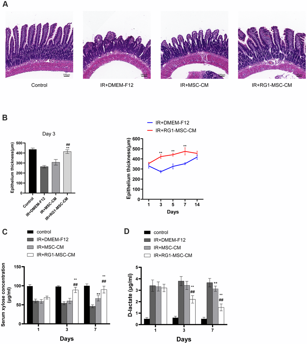 We further investigated the structural and functional change in rats. To examine the effect of CM on structural damage in RIII, intestinal segments were stained by Hematoxylin-eosin. Histological evaluation in post-irradiation period revealed necrotic epithelia, atrophy villi, inflammatory cell infiltration and a decrease in the number of crypts (Figure 3A). The pathohistological damage of the intestine was improved in the RG1-MSC-CM group, with increase in epithelium thickness compared to MSC-CM group and DMEM-F12 group (Figure 3A). With application of RG1-MSC-CM, the epithelium thickness was improved on day 3 and almost recovered to the same level as the control group on day 5, while those with MSC-CM only exhibited a slight change in the villi thickness (Figure 3B).