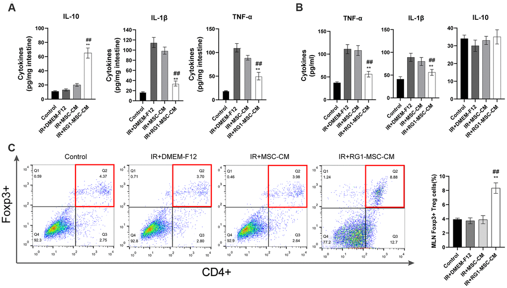 To investigate the effect of RG1-MSC-CM on inflammatory responses on RIII, we evaluated IL-1β, TNF-α, IL-10 in vivo and in vitro. While radiation upregulated the level of pro-inflammatory factors (IL-1β and TNF-α), RG1-MSC-CM rather than MSC-CM significantly reversed the increase in vivo and in vitro (Figure 5A, 5B). Although the level of IL-10 in the mucosa was significantly increased by RG1-MSC-CM, the effect was not prominent in vitro (Figure 5B). To further investigate the immunomodulatory of RG1-MSC-CM, we collected tissue samples from the mesenteric lymph nodes (MLNs) on day 3. As shown in Figure 5, the percentages of CD4+Foxp3+ Treg cells in the MLNs were significantly increased with the treatment of RG1-MSC-CM, suggesting RG1-MSC-CM induced a downregulation of local proinflammatory response after irradiation (Figure 5C).