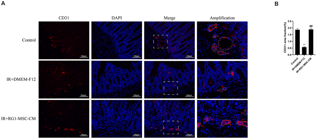 To investigate the effect of RG1-MSC-CM on the angiogenesis of intestine of irradiated rats, immunofluorescence staining for CD31, a pan-endothelial marker representing the extent of angiogenesis [27], was performed on day 3 after radiation. As shown in Figure 6, the CD31-positive area fraction in IR+DMEM-F12 group was significantly decreased compared to that in control group, suggesting the impaired angiogenesis induced by radiation. With administration of RG1-MSC-CM, the area fraction of CD31 was greatly increased compared to that in IR+DMEM-F12 group (P < 0.05). No statistical difference was observed between IR+MSC-CM group and IR+DMEM-F12 group. (Figure 6A, 6B). Taken together, these findings suggested RG1-MSC-CM promotes the angiogenesis of intestine in the irradiated rats.
