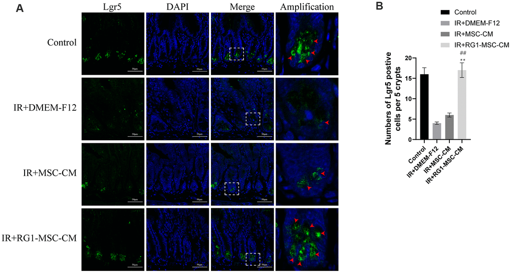 Intestinal cell marked by Leucine-rich repeat-containing G protein-coupled receptor 5 (Lgr5) is a kind of ISCs responsible for modulating epithelium homeostasis, renewal and regeneration after injury [28]. Immunofluorescence staining showed that 3 days radiation significantly decreased the number of Lgr5 positive cells in the crypts compared to control group, with 0~2 Lgr5-positive cells localized to the crypts. While MSC-CM caused limited improvement in the expression of Lgr5, RG1-MSC-CM significantly improved the number of Lgr5 positive cells. Taken together, these findings suggested that RG1-MSC-CM increased the proliferation of ISCs in the intestine after radiation. (Figure 7).