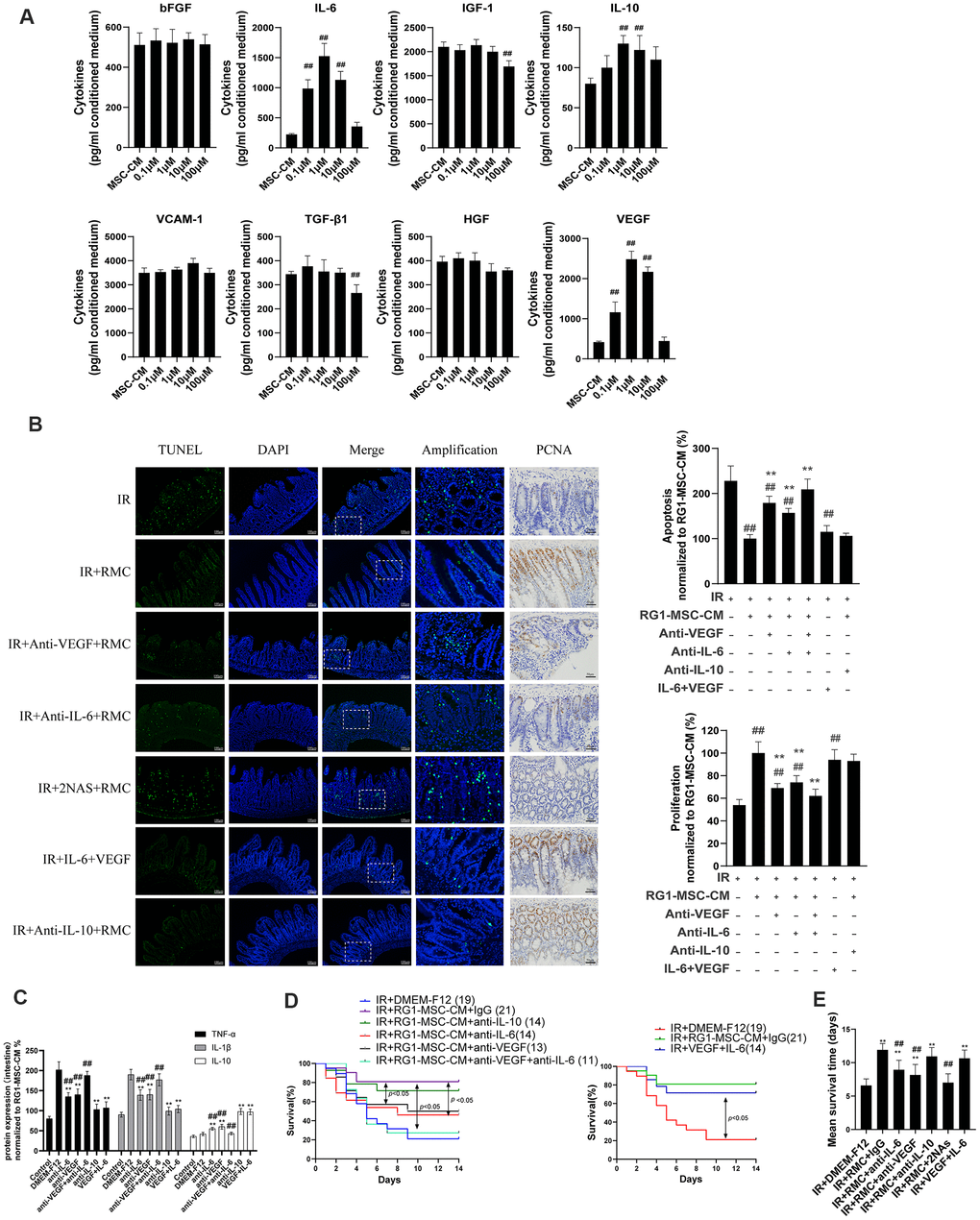 VEGF, interleukin 6 (IL-6), basic fibroblast growth factor (bFGF), hepatocyte growth factor (HGF), interleukin-10 (IL-10), transforming growth factor-β (TGF-β1) in unconcentrated medium were measured by ELISA kit (R&D systems, Minneapolis, MN, US). Vascular cell adhesion molecule-1 (VCAM-1) were measured by ELISA kit (Abbexa, Cambridge, UK). Intestinal tissue samples and supernatant of IEC-6 were assayed by ELISA kit (R&D systems, Minneapolis, MN, US) for interleukin-1β (IL-1β), IL-10, tumor necrosis factor alpha (TNF-α).