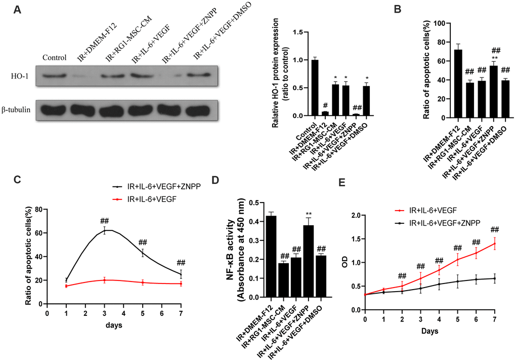 As induction of HO-1 has been reported to ameliorate RIII and IL-6/VEGF can modulate the expression of HO-1 [30–33], We next investigated the effect of IL-6 and VEGF on HO-1 expression in vitro. As shown by western blot, radiation significantly downregulated the expression of HO-1 in IEC-6 compared to control group (P < 0.05) (Figure 9A). The expression of HO-1 was significantly upregulated in RG1-MSC-CM and IL-6+VEGF group compared to IR+DMEM-F12 group (P < 0.05) (Figure 9A), and this was reversed by ZNPP. To further investigate whether HO-1 is responsible for the therapeutic benefit of IL-6+VEGF in RIII, we evaluated apoptosis, NF-kB binding activity, a maker of acute gut mucosa inflammation [34], and cell viability of IEC-6. As shown in Figure 9B–9E, the therapeutic effects of IL-6+VEGF on apoptosis, NF-kB binding activity and the cell viability of IEC-6 were partially inhibited by ZNPP. These finding suggests that the therapeutic effect of IL-6 and VEGF on RIII is at least partially mediated in a HO-1 dependent mechanism. (Figure 9B–9E).