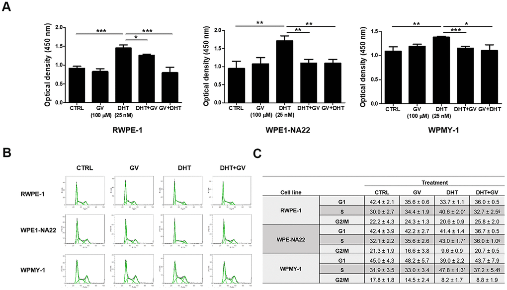 RWPE-1 (1 × 104), WPE1-NA22 (1 × 104) and WPMY-1 (2.5 × 103) cells were seeded in 96 well plates. After 16 h, cells were treated with DHT (25 nM; Sigma, St. Louis, MO, USA) and GV1001 (100 μM; GemVax and KAEL, Sungnam, Korea) for 48 h. After removal of the medium by suction, cells were incubated with Cell Counting Kit-8 assay (CCK-8; Dojindo Laboratories, Kumamoto, Japan) solution for 1–4 h. Optical density was measured at 450 nm in a spectrophotometer (Molecular Devices, Sunnyvale, CA, USA) according to the manufacturer’s instructions.