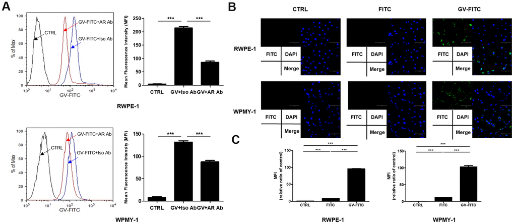 Since AR antagonists are used widely to treat BPH, we next examined whether GV1001 binds to AR expressed by prostatic epithelial and stromal cells. We found that binding of FITC-conjugated GV1001 to AR, expressed by RWPE-1 and WPMY-1 pre-treated with an anti-AR antibody, was lower than that to cells treated with an isotype control (Figure 2A). Thus, binding of GV1001 to AR in the cytoplasm of prostate cells was inhibited by the anti-AR antibody, suggesting that GV1001 combines with AR. GV1001 penetrates the membrane of cells, including both primary and tumor cells [21]; therefore, we subjected cells to internalization assays followed by fluorescence microscopy. GV-FITC showed higher cell penetrating activity that the control (Figure 2B). Next, to confirm the interaction between GV1001 and AR under physiological conditions, we attempted to identify GV1001-interacting proteins by co-precipitation with an anti-AR antibody. The interactions with GV1001 were confirmed in a microplate reader. The mean fluorescence intensity (MFI) of GV-FITC was much higher than that of the negative or FITC-only controls (Figure 2C). Taken together, these data support an interaction between GV1001 and AR.