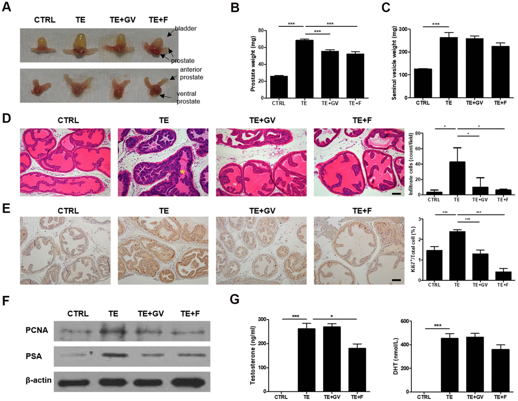 To verify the therapeutic effect of GV1001 in vivo, a mouse model for BPH was established in which testosterone enanthate (TE) was infused by a micro-osmotic pump. Enlargement of the prostate after injection of TE was suppressed by GV1001. The effect was similar to that of treatment with finasteride, a 5-alpha reductase inhibitor, which was used as a positive control (Figure 3A, 3B). There was no marked difference among TE-induced groups with respect to the weight of seminal vesicles (Figure 3C). The body weight of mice with BPH fell slightly and only recovered after treatment with finasteride (Supplementary Figure 2). Moreover, we noted hyper-proliferation of cells in the prostate, irregular shaped prostatic glands, and infiltration by inflammatory immune cells in lumen after implantation of the TE-containing micro-osmotic pump; however, these effects were ameliorated by GV1001 (Figure 3D). The results from the GV1001-treated group were similar to those of the group treated with finasteride. Greater nuclear localization of Ki67, a proliferation marker, was observed in the TE-induced BPH prostate, but this decreased in the GV1001- or finasteride-treated prostate (Figure 3E). Cell proliferation was assessed by immunoblot analysis of prostate lysates with an antibody specific for cell nuclear antigen (PCNA). In addition, prostate specific antigen (PSA) levels were measured to detect irritation or infection of the prostate in BPH [22]. Expression of PCNA and PSA in prostate tissue from mice implanted with a micro-osmotic pump containing TE was high; however, expression of both was suppressed completely by treatment with GV1001 or finasteride (Figure 3F and Supplementary Figure 5). The plasma concentration of testosterone and DHT was measured in an enzyme immunoassay (EIA) to investigate whether GV1001 affects endogenous production of testosterone and its conversion to DHT. In contrast to the effect of finasteride, GV1001 did not suppress testosterone production or its conversion to DHT in mice fitted with the osmotic pump (Figure 3G).