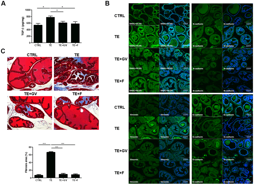 Androgen/AR signals affect initiation and progression of BPH by altering expression of factors involved in EMT [9, 23]. In general, TGF-β, generated by the interaction between androgens and AR, plays an important role in EMT that accompanies fibrosis in the prostate [24]. TGF-β production in mice implanted with a micro-osmotic pump containing TE increased markedly, but was suppressed effectively by GV1001 and finasteride (Figure 4A). In the case of many carcinomas, TGF-β appears to be responsible for induction or functional activation of a series of EMT-inducing transcription factors in cancer cells, notably Snail and Slug. Also, Snail represses expression of epithelial makers (e.g., E-cadherin) and induces expression of EMT-associated mesenchymal markers (e.g., N-cadherin and Vimentin) [25, 26]. To clarify the specific mechanisms by which GV1001 prevents TGF-β-induced EMT in the prostate, we examined changes in expression of Snail, Slug, N-cadherin, Vimentin, and E-cadherin. Increased expression of Snail, Slug, N-cadherin, and Vimentin in TE-induced mice was suppressed by GV1001. By contrast, expression of E-cadherin, which is related to MET, a process opposite to that of EMT, was downregulated by TE but recovered in the presence of GV1001 (Figure 4B). EMT leads to pathologic fibrosis; therefore, we next performed Masson’s Trichrome staining to examine whether GV1001 prevents TGF-β-induced fibrosis in the prostate. We found that extensive fibrosis induced by TE was prevented by GV1001 and finasteride (Figure 4C).