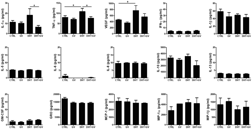 In general, inflammatory responses are accompanied by development and progression of BPH. In fact, when human monocytic cell line THP-1 is treated with DHT, production of TNF-α increases in accordance with cell activation [27]. Therefore, we investigated the ability of GV1001 to regulate production of inflammatory cytokines in PBMCs stimulated with DHT. Overall, we examined the levels of 15 cytokines in response to DHT stimulation in the presence/absence of GV1001. We found that DHT increased the levels of IL-1α, TNF-α, and VEGF; however, GV1001 only downregulated IL-1α and TNF-α to a marked extent (Figure 5)